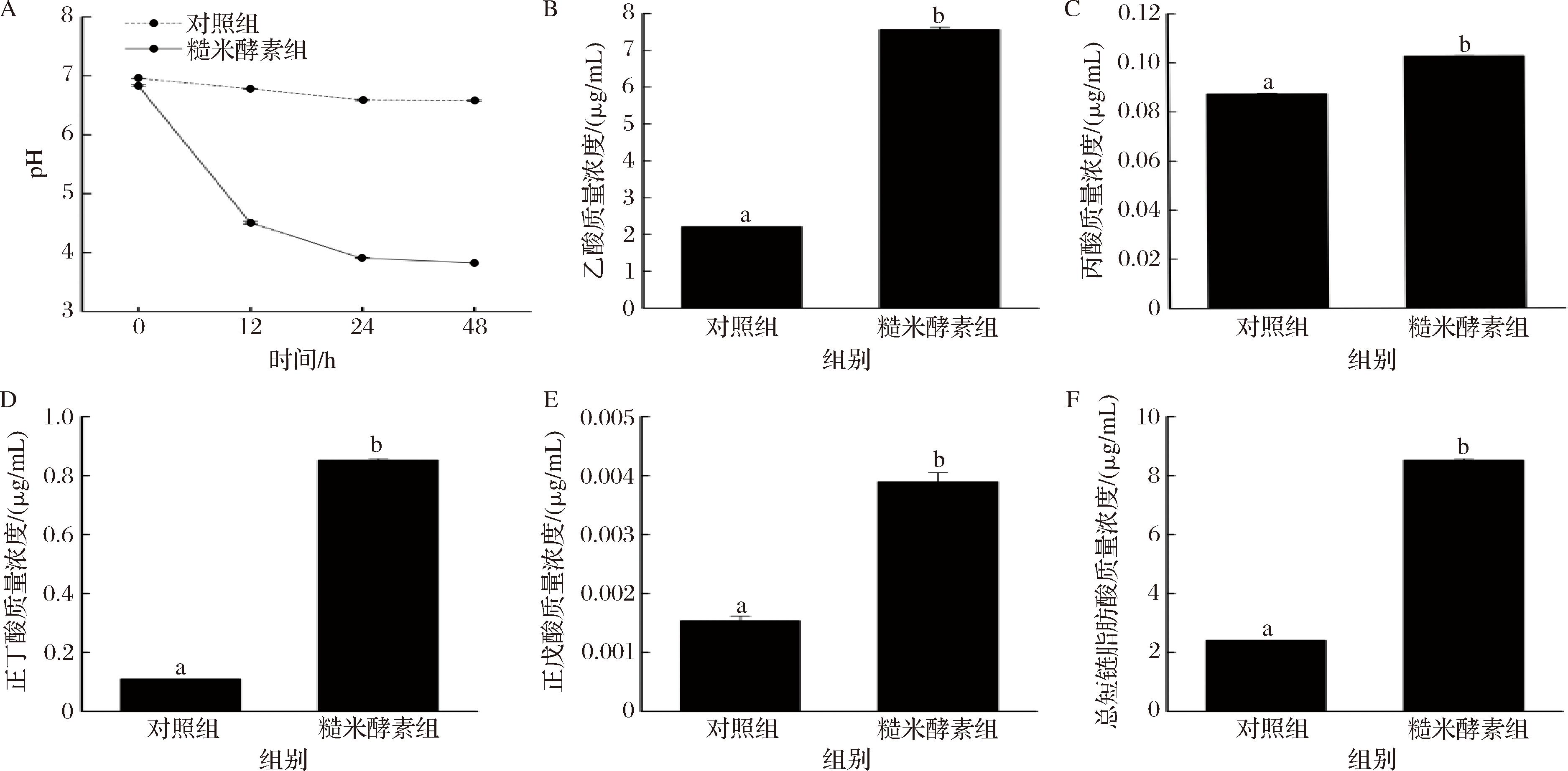 A-pH;B-乙酸质量浓度;C-丙酸质量浓度;D-正丁酸质量浓度;E-正戊酸质量浓度;F-总短链脂肪酸质量浓度