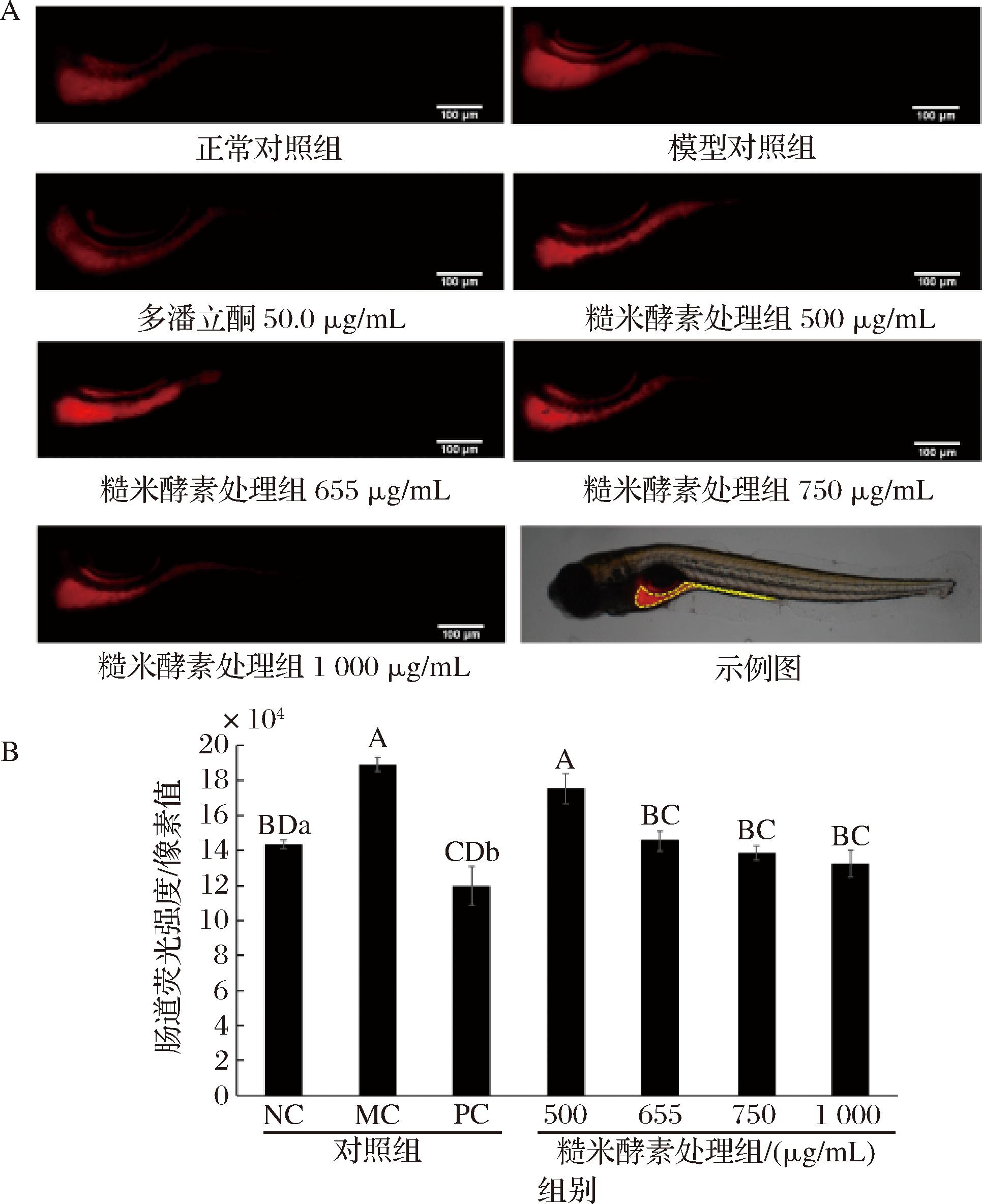 采用水溶尼罗红方式对斑马鱼肠道染色,每组随机选取10尾斑马鱼在荧光显微镜下拍摄照片,分析斑马鱼肠道荧光强度,以评价斑马鱼的肠道运动情况。
