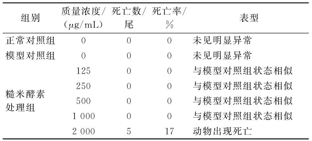 组别质量浓度/(μg/mL)死亡数/尾死亡率/%表型正常对照组000未见明显异常模型对照组000未见明显异常糙米酵素 处理组 12500与模型对照组状态相似25000与模型对照组状态相似50000与模型对照组状态相似1 00000与模型对照组状态相似2 000517动物出现死亡