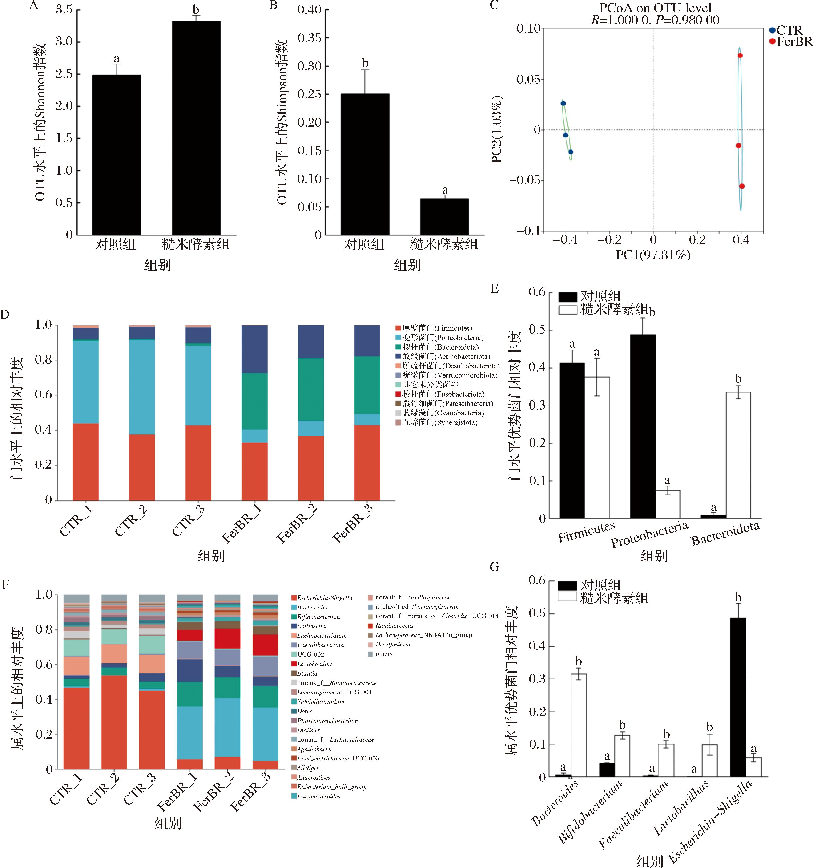 A-OTU水平上的Shannon指数图;B-OTU水平上的Simpson指数图;C-OTU水平上的PCoA图;D-门水平上的菌群相对丰度图;E-优势菌门相对丰度柱形图;F-属水平上的菌群相对丰度柱形图;G-优势菌属相对丰度柱形图
