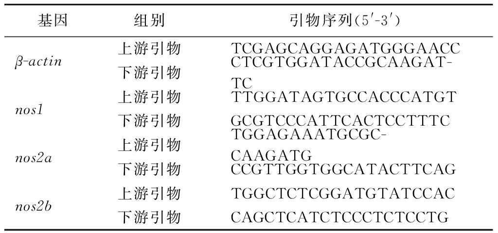 提取斑马鱼总RNA,取2.00 μg反转录20.0 μL cDNA,通过q-PCR检测β-actin、nos1、nos2a和nos2b基因的表达。以β-actin作为基因表达的内参,计算nos1、nos2a和nos2b基因的相对表达量。引物序列详见表1。