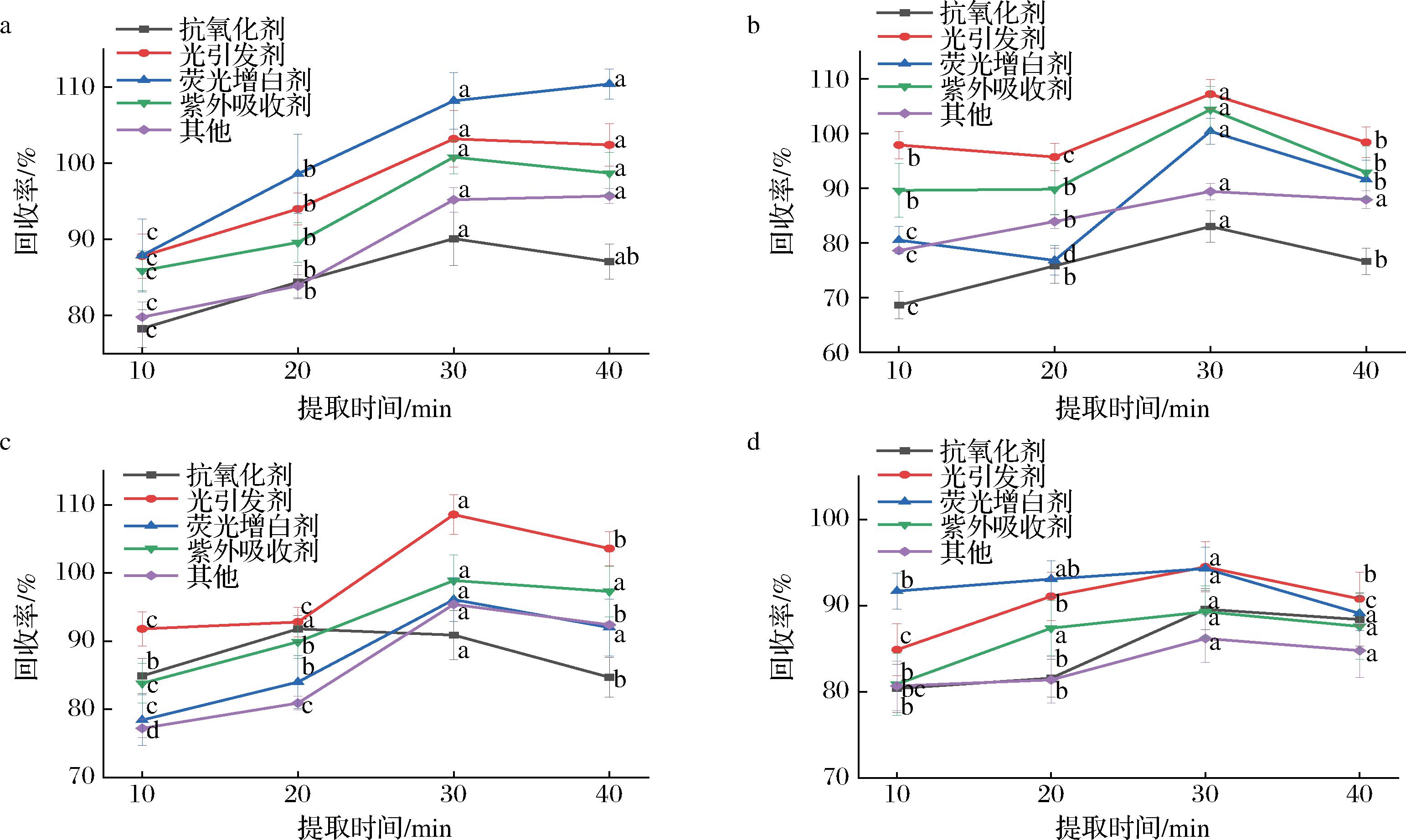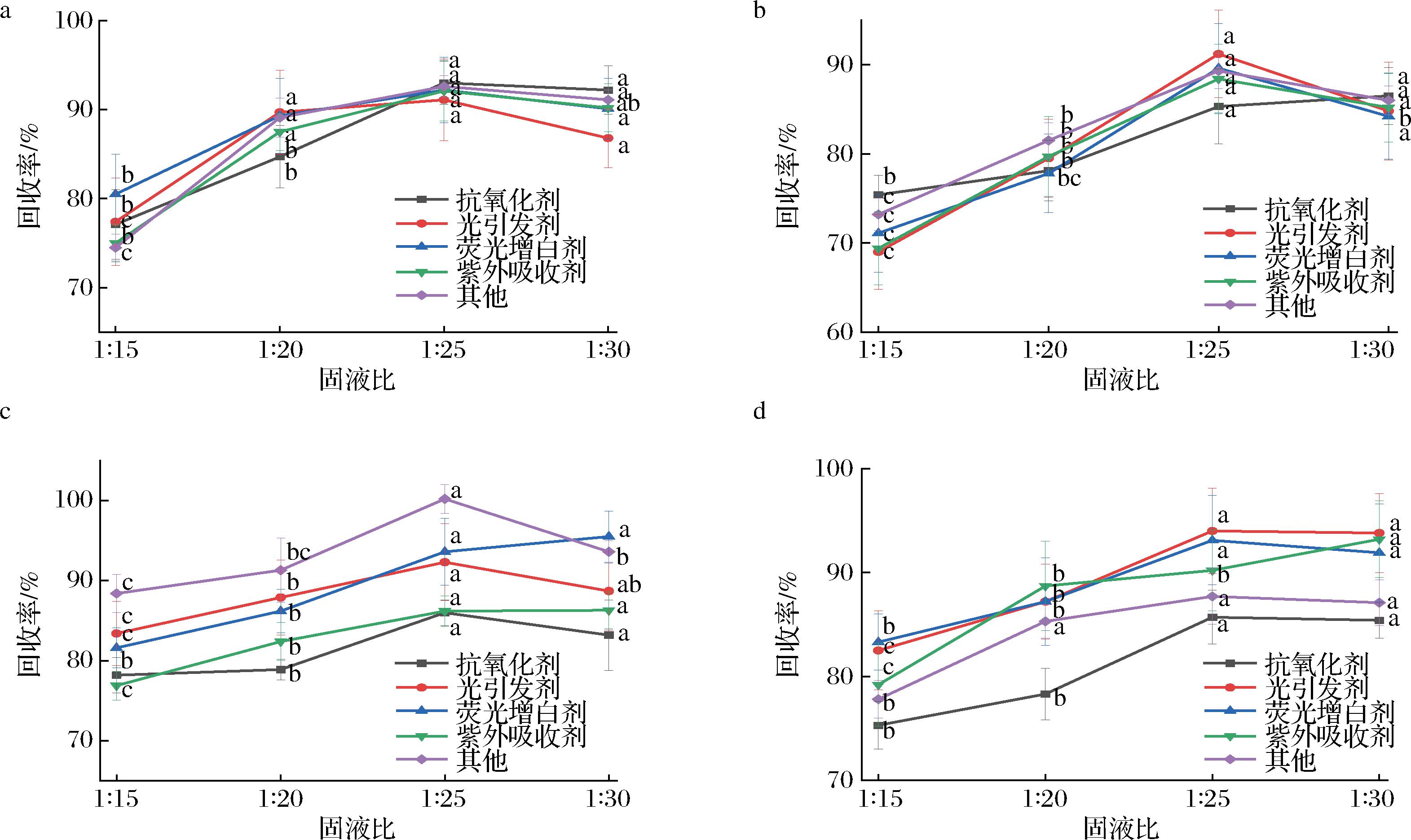 取0.2 g样品,分别按照1∶15、1∶20、1∶25、1∶30的固液比(g∶mL)加入不同体积(3、4、5、6 mL)的乙腈,超声提取30 min后测定4种塑料材料中五类添加剂的回收率,实验结果如图3所示。可以看出,4种塑料中各类添加剂的回收率均是在固液比为1∶25时达到最高,在1∶30时回收率基本保持不变甚至降低。这可能是由于溶剂量较小时,没有充分提取出塑料样品中的添加剂,而当溶剂量过大时,包装中添加剂已被充分提取,剩余的溶剂导致提取溶液稀释。将各类添加剂在不同提取固液比下的回收率进行显著性分析,结果表明在PP材料中,抗氧化剂和紫外吸收剂在固液比为1∶25时的回收率与1∶30无显著性差异,且显著(P<0.05)高于其余固液比下的回收率,剩余三类添加剂在1∶20时的回收率与1∶25、1∶30相比无显著性差异;在PE材料中,固液比为1∶25时的回收率显著(P<0.05)高于1∶15、1∶20,与1∶30相比除光引发剂外均无显著性差异;在PA材料和PET材料中除其他类外,固液比1∶25时的回收率相比于1∶30无显著性差异,且显著(P<0.05)高于其余两者的回收率。因此,本实验选用的超声固液比为1∶25。