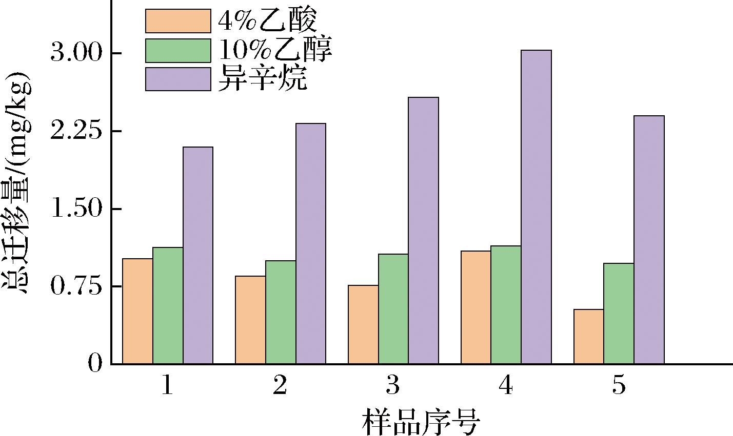 根据上述结果,选取样品添加剂残留量测定中含量较高的5个代表性样品,在4%乙酸、10%乙醇、异辛烷3种食品模拟物下进行迁移实验。结合预制菜的实际应用条件,模拟了灭菌、贮藏以及再加热过程。对于水基模拟物,选择121 ℃ 0.5 h、40 ℃ 10 d、100 ℃ 0.5 h的迁移条件;对于油脂类模拟物,选择60 ℃ 1.5 h、20 ℃ 2 d、60 ℃ 0.5 h的迁移条件。对比5个样品在3种模拟物下32种添加剂的总迁移量,结果如图5所示。样品在异辛烷中的总迁移量明显高于其余2种,表明预制菜在油脂类食品模拟物中的迁移风险更高。因此,本研究将100批次预制菜塑料包装样品在油脂类模拟物中的迁移量进行了测定,结果如表6所示。其中抗氧化剂2246、硬脂酸以及油酸酰胺的检出率高达99%以上,其余物质的检出率较低,且各添加剂的迁移量均较少。此外,荧光增白剂OB在部分样品中也被检出,但其浓度低于定量限,迁移量测定中所有样品均未超标。