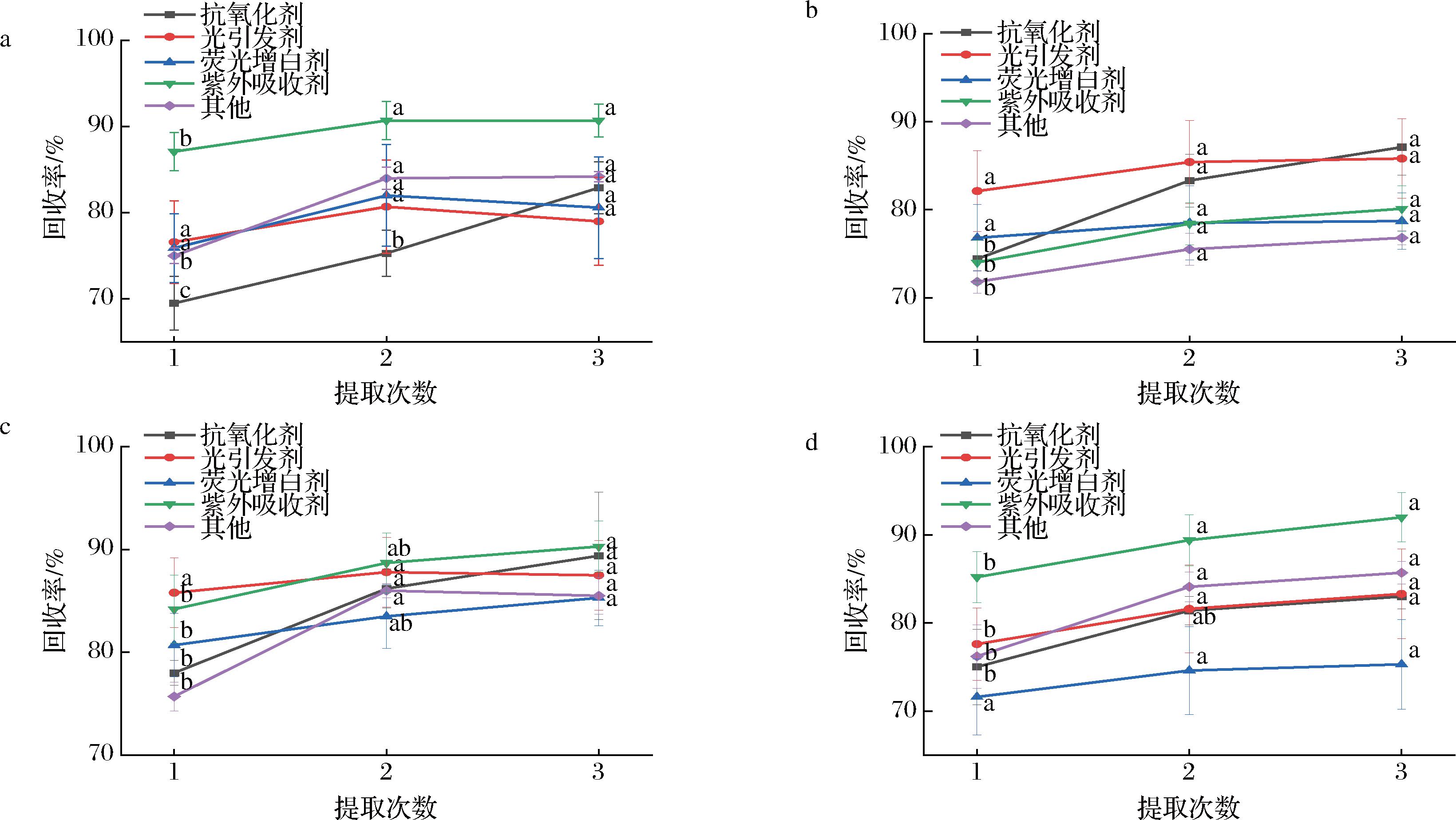 取0.2 g PP、PE、PA、PET样品,加入5 mL乙腈超声提取30 min,比较不同提取次数下(1、2、3次)4种塑料材料中五类添加剂的回收率。