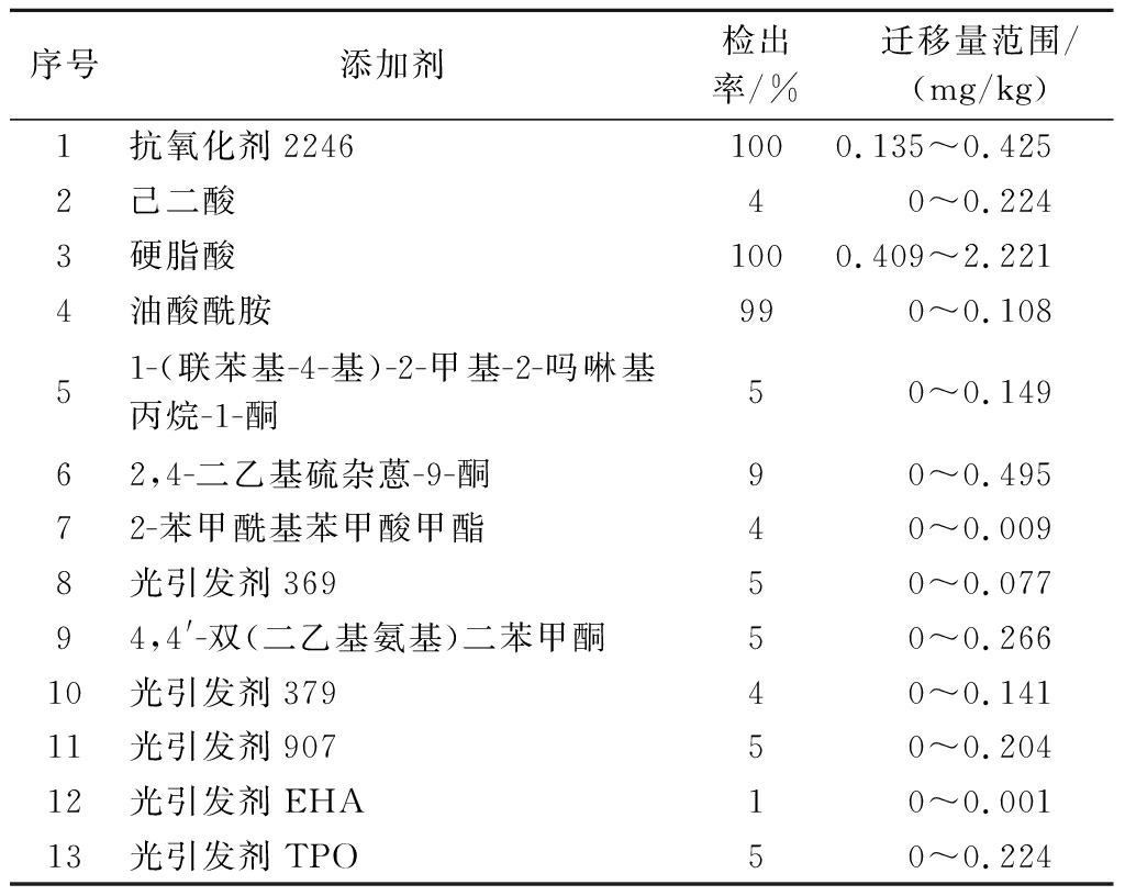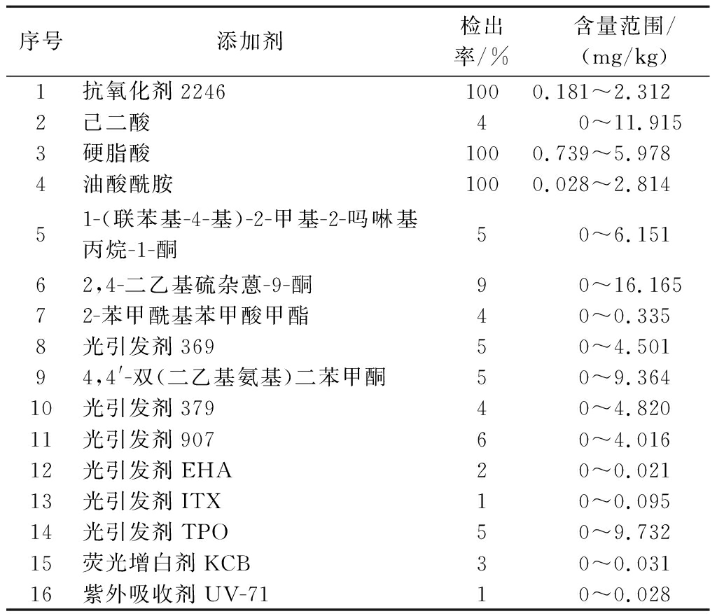 序号添加剂检出率/%含量范围/(mg/kg)1抗氧化剂2246100 0.181~2.312 2己二酸4 0~11.9153硬脂酸100 0.739~5.978 4油酸酰胺100 0.028~2.814 51-(联苯基-4-基)-2-甲基-2-吗啉基丙烷-1-酮5 0~6.15162,4-二乙基硫杂蒽-9-酮9 0~16.16572-苯甲酰基苯甲酸甲酯40~0.3358光引发剂3695 0~4.50194,4'-双(二乙基氨基)二苯甲酮5 0~9.36410光引发剂3794 0~4.82011光引发剂9076 0~4.01612光引发剂EHA2 0~0.02113光引发剂ITX1 0~0.09514光引发剂TPO5 0~9.73215荧光增白剂KCB3 0~0.03116紫外吸收剂UV-711 0~0.028