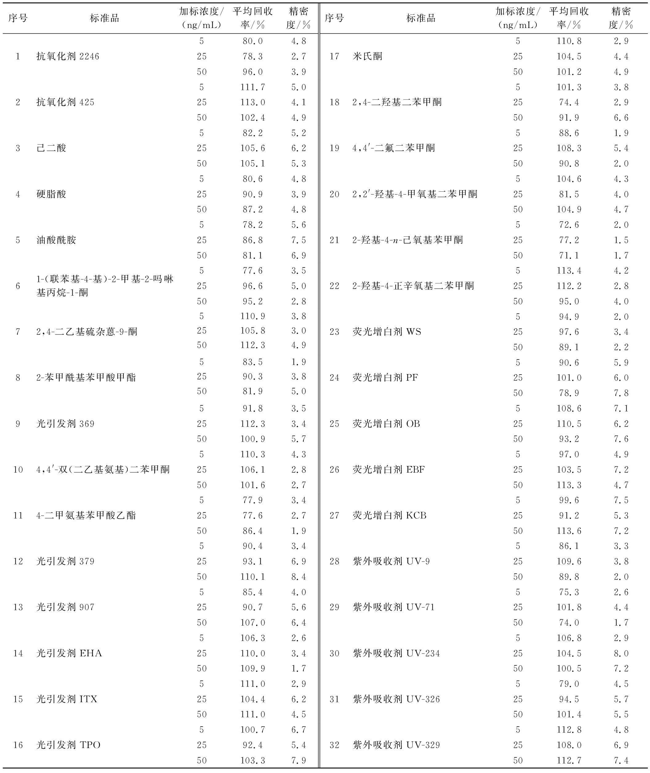 表3 食品包装材料中三十二种添加剂的加标平均回收率及其精密度