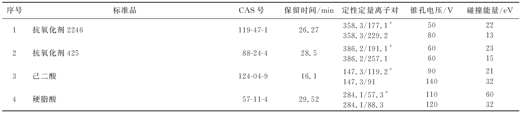 序号标准品CAS号保留时间/min定性定量离子对锥孔电压/V碰撞能量/eV1抗氧化剂2246119-47-126.27358.3/177.1*358.3/229.2508022132抗氧化剂42588-24-428.5386.2/191.1*386.2/257.1606023153己二酸124-04-916.1147.3/119.2*147.3/919014021324硬脂酸57-11-429.52284.1/57.3*284.1/88.31101206032