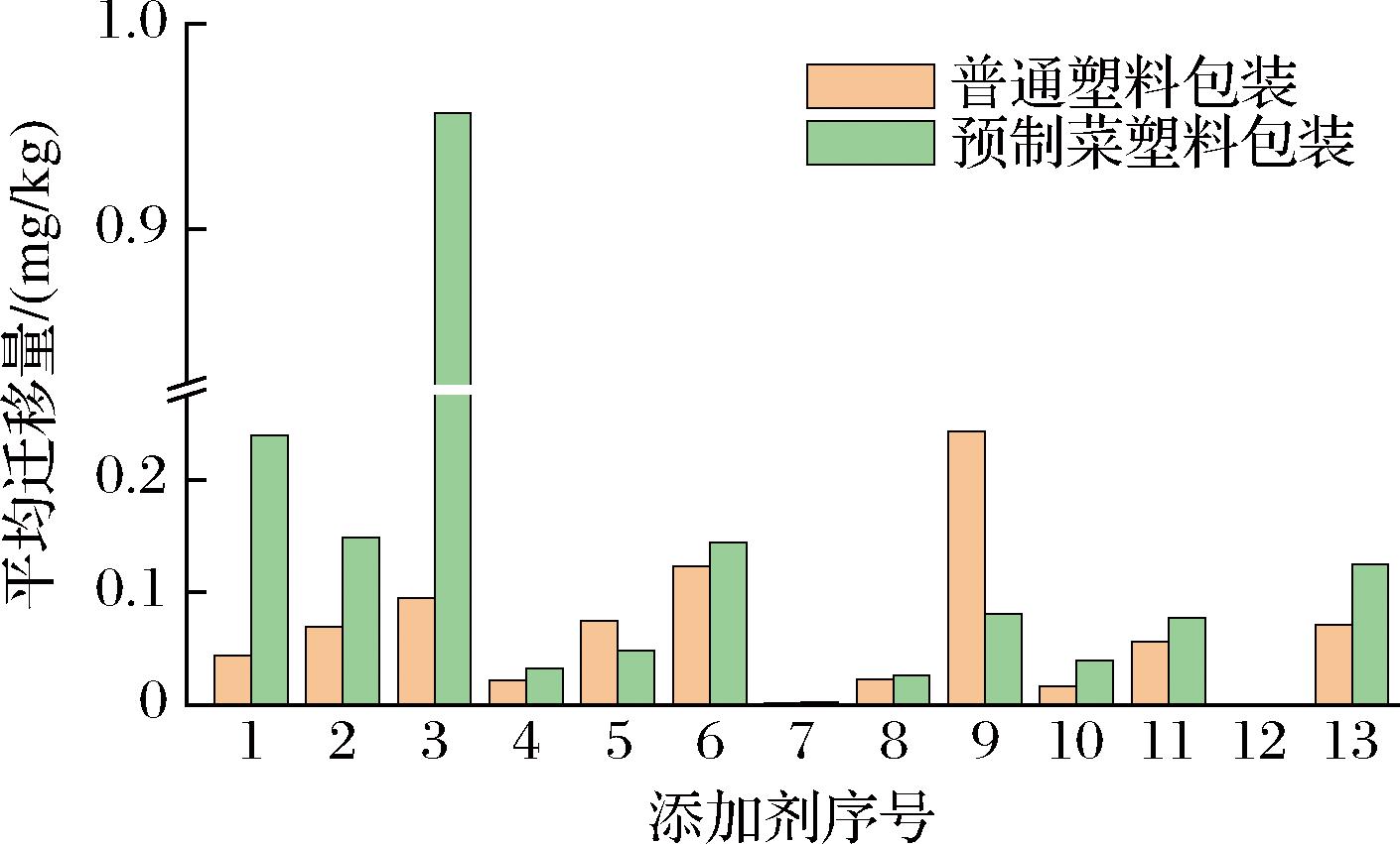 此外将上述结果与100个样品在普通塑料包装迁移条件(40 ℃ 10 d)下各添加剂的平均迁移量进行了对比,结果如图6所示。由图6可知,模拟预制菜加工过程后13种添加剂的平均迁移量均显著高于普通处理。因此,这些包装在作为预制菜包装时存在的风险明显高于普通食品包装。
