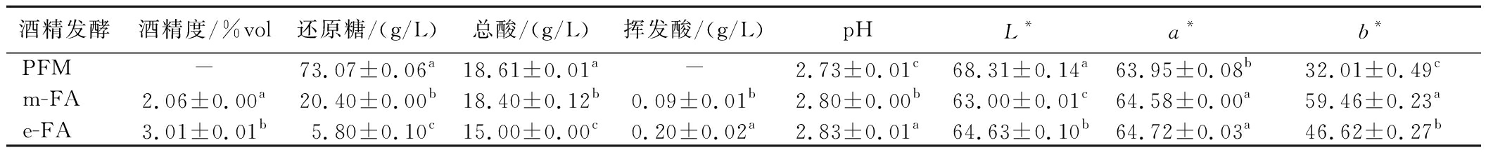 酒精发酵酒精度/%vol还原糖/(g/L)总酸/(g/L)挥发酸/(g/L)pHL*a*b*PFM-73.07±0.06a18.61±0.01a-2.73±0.01c68.31±0.14a63.95±0.08b32.01±0.49cm-FA2.06±0.00a20.40±0.00b18.40±0.12b0.09±0.01b2.80±0.00b63.00±0.01c64.58±0.00a59.46±0.23ae-FA3.01±0.01b5.80±0.10c15.00±0.00c0.20±0.02a2.83±0.01a64.63±0.10b64.72±0.03a46.62±0.27b