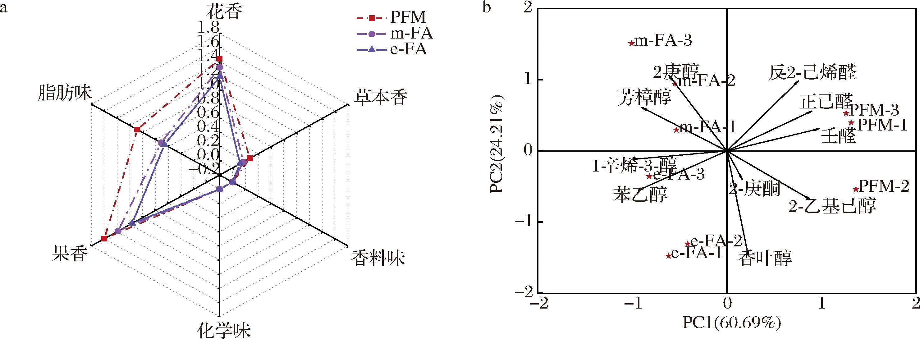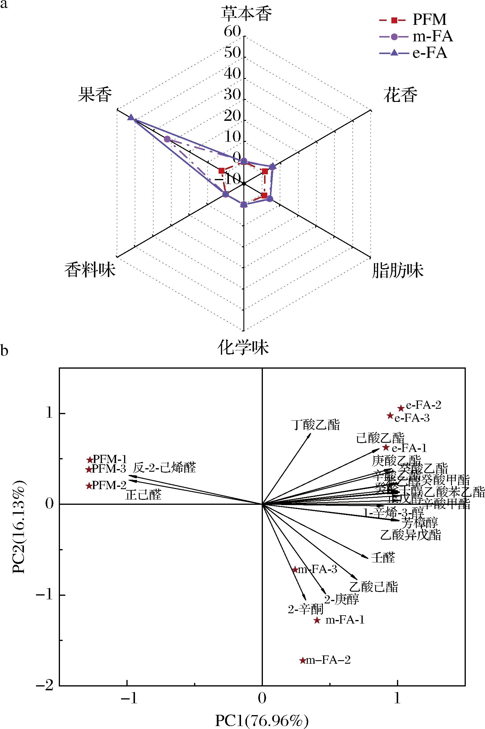 尽管结合态香气化合物通常不具备直接呈香能力,本研究仍参照游离态挥发性成分的分析方法,对10种主要结合态挥发性化合物进行香气轮廓分析及PCA,以评估其潜在香气贡献。由图3-a可知,红树莓在酒精发酵阶段以花香和果香为主,脂肪味次之,发酵过程中各香气特征基本保持不变。PCA分析表明(KMO=0.650>0.6)(图3-b),PFM供试样品与2-乙基己醇、壬醛、C6醛(正己醛和反-2-己烯醛)的高含量有关,主要反映花香、果香、脂肪味、青草香特征。m-FA供试样品与2-庚醇、芳樟醇密切相关,主要表现为花香、果香特征。苯乙醇和1-辛烯-3-醇与e-FA酒样密切相关,主要反映花香、脂肪味和青草香特征。