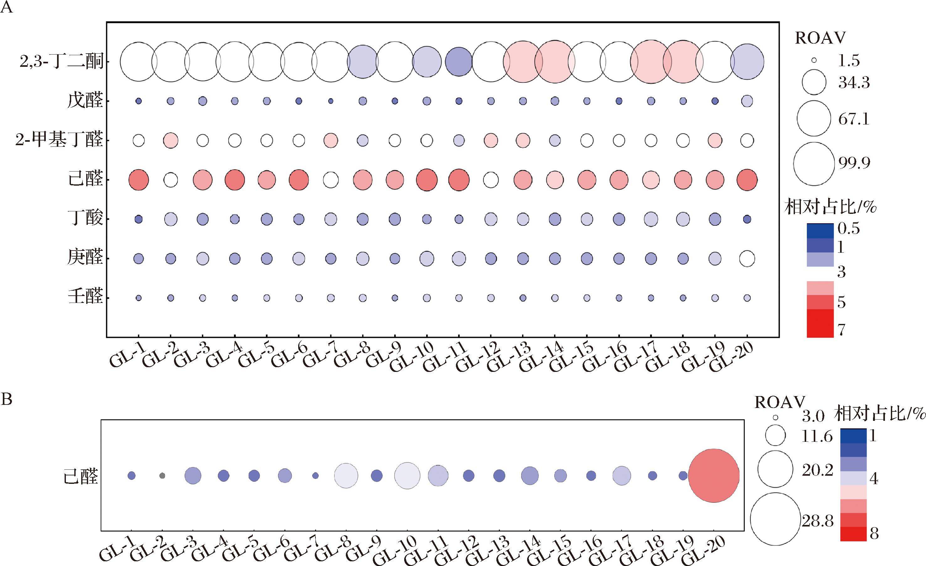 挥发性化合物对高粱特有风味的贡献不仅与化合物占比有关,而且与化合物的感官阈值有关,一些阈值和浓度较低的挥发性化合物在风味中仍然发挥着显著作用[27]。因此,为评估单个化合物对整体风味的贡献,以ROAV≥1、VIP>1为标准[28],筛选20种高粱的关键差异挥发性化合物。在GC-IMS检出化合物中筛选出7种关键差异化合物,分别为壬醛、庚醛、丁酸、己醛、2-甲基丁醛、戊醛、2,3-丁二酮(图6-A);在HS-SPME-GC-MS检出化合物中筛选出1种关键差异化合物,为己醛(图6-B)。