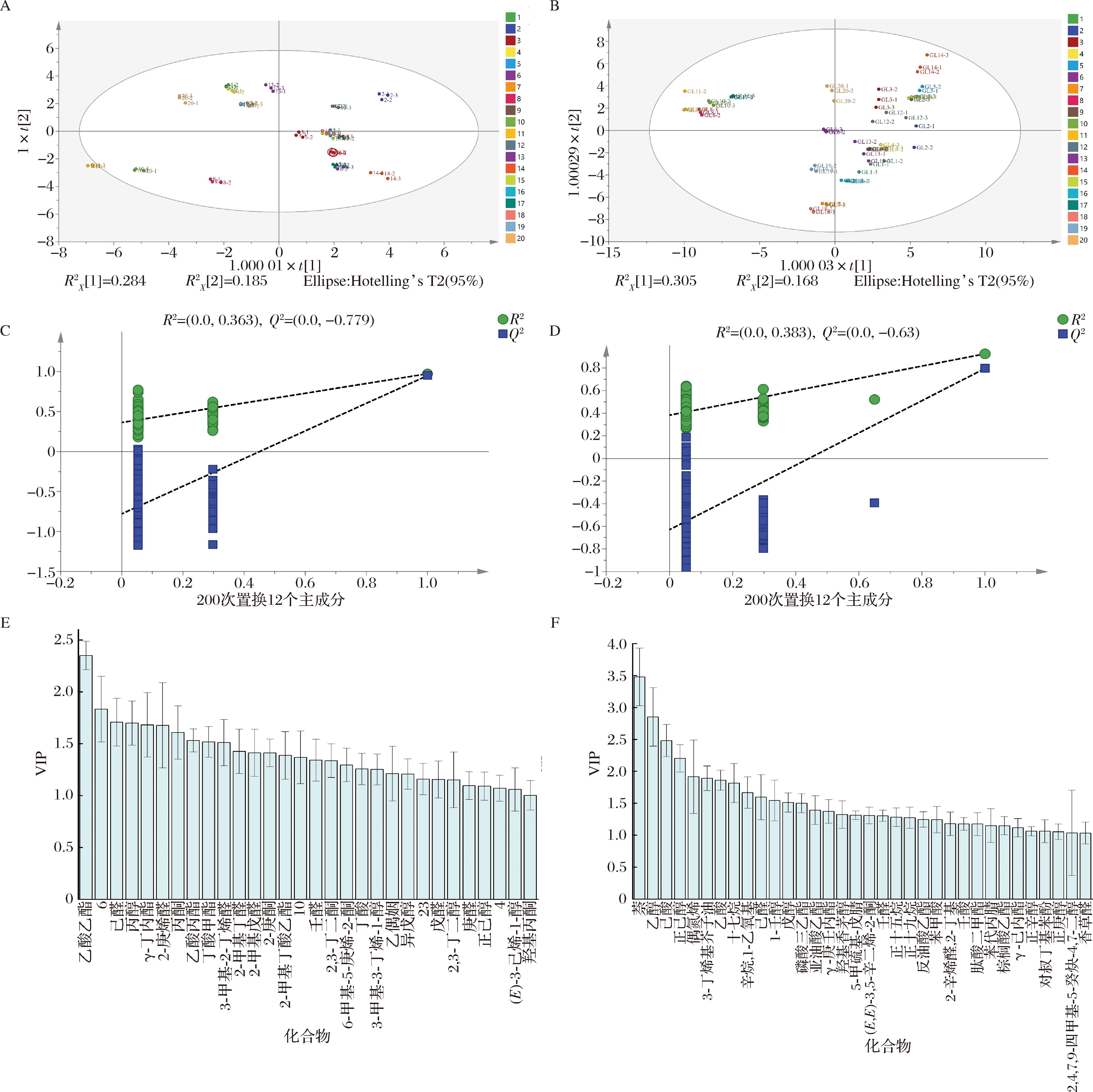 A-GC-IMS的OPLS-DA得分图;B-HS-SPME-GC-MS的OPLS-DA得分图;C-GC-IMS的交叉验证;D-HS-SPME-GC-MS的交叉验证;E-GC-IMS的VIP值图;F-HS-SPME-GC-MS的VIP值图