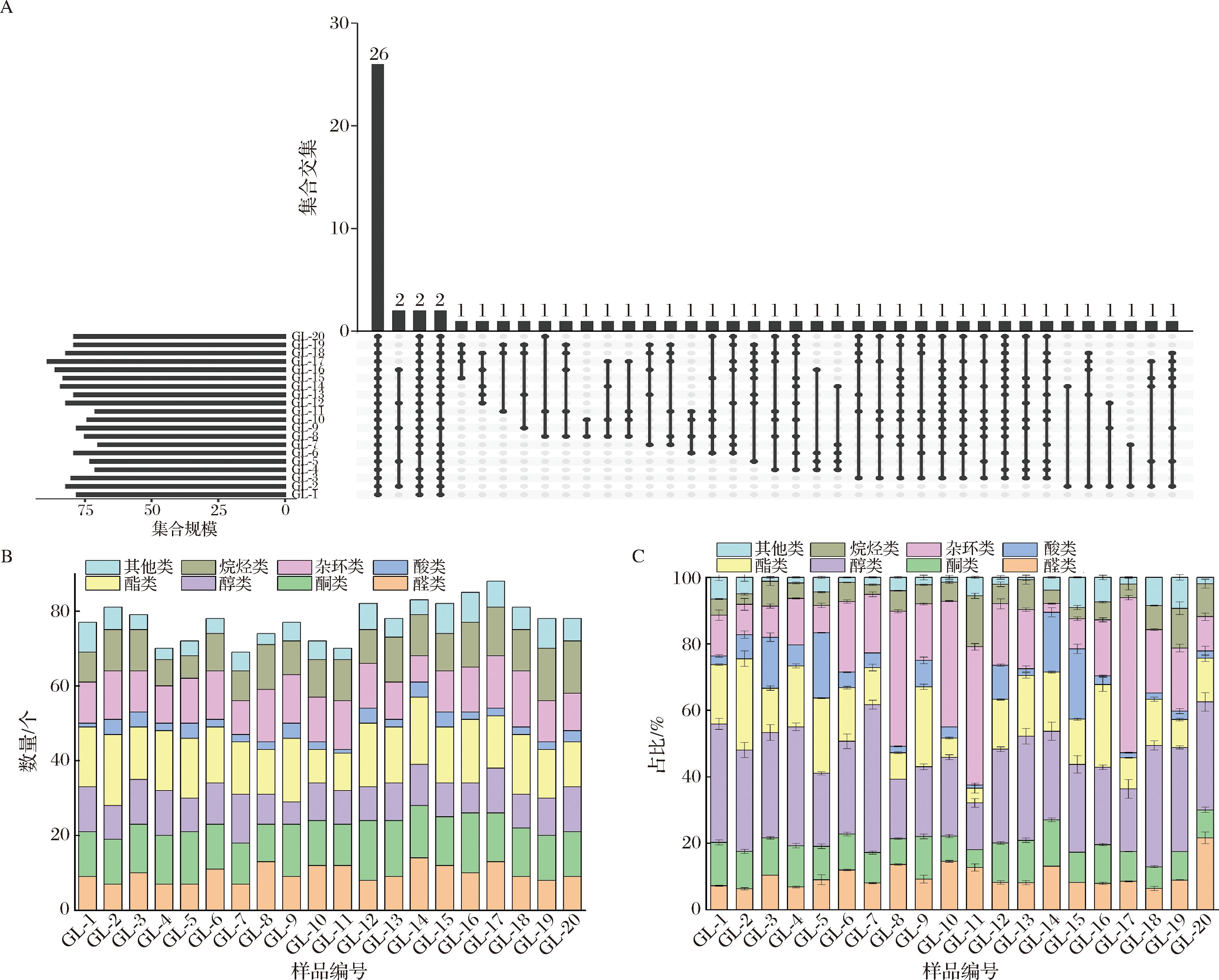 为了直观展示20种高粱挥发性化合物的重叠情况,做Upset图(图4-A)。20个品种高粱中共有的挥发性化合物有26种,为乙醇、2-庚酮、十二烷、2-戊基呋喃、正己醇、壬醛、反-2-辛烯醛、苯甲醇、γ-庚壬内酯等化合物。其中,在GL-5中未检出反式-3-壬烯-2-酮和2,2,4-三甲基戊二醇乙丁酯,其他品种高粱中均有检出;辛酸乙酯仅在GL-2、GL-7样品中检测到;GL-2、GL-14特有的挥发性化合物为2-丁基-2-辛烯醛;羟基香茅醇和2-吡咯甲醛为GL-8和GL-10特有的挥发性化合物。