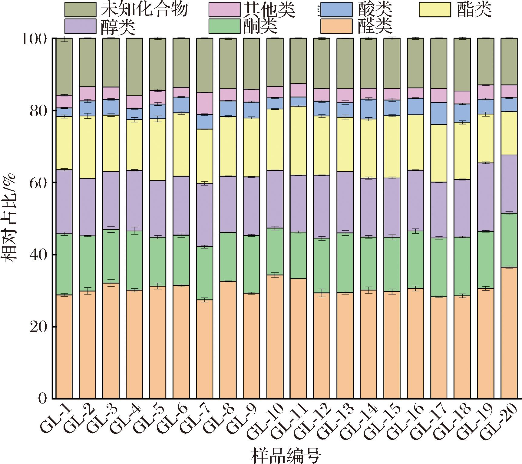 为了清晰地比较不同高粱品种间的差异,以GL-1高粱样品为参照,通过扣减参照得到其他高粱样品的扣减图谱(图1-B)。蓝色和红色分别表示样品中的挥发性化合物含量低于和高于参照[15]。GL-14和GL-20的红色点比参照高粱样品中多,说明这2个品种高粱样品中部分化合物浓度高于参照。相比之下,GL-10和GL-11有大量蓝色点,表明这些化合物浓度低于参照。根据气相色谱的保留时间和离子迁移时间对高粱中挥发性化合物进行鉴定,共鉴定出73种挥发性化合物(附表1,https://doi.org/10.13995/j.cnki.11-1802/ts.041746),其中醛类23种,酮类8种,醇类16种,酯类14种,酸类6种,其他类6种。由于数据库中的化合物有限,有23种化合物无法鉴定。