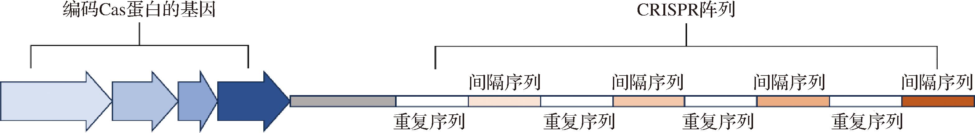 CRISPR/Cas系统由CRISPR阵列和Cas蛋白2部分组成。前者用于储存和记录外源核酸入侵的信息,后者负责具体实施免疫防御功能。CRISPR阵列由一系列短的重复序列和间隔序列交替排列构成,其两侧则是编码不同Cas蛋白的基因(图1)[7]。