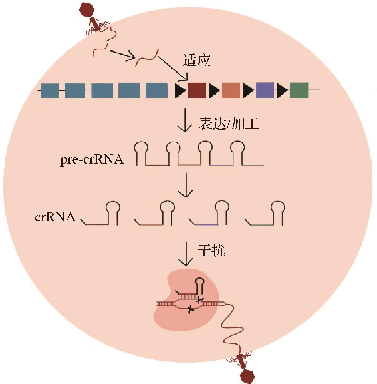 CRISPR/Cas免疫反应包括3个阶段:适应、表达/加工和干扰。在适应阶段,Cas1、Cas2等蛋白将首次入侵的外源基因序列切割并整合到CRISPR阵列中,从而形成免疫记忆。在表达阶段,当外源基因再次入侵时,细菌会转录CRISPR序列,并由核糖核酸酶或Cas蛋白将其加工成成熟的crRNA。最后,在干扰阶段,crRNA与相应的Cas蛋白形成核糖核蛋白复合物,引导Cas蛋白对目标外源基因进行特异性切割,从而阻止其增殖和传播(图2)[8]。