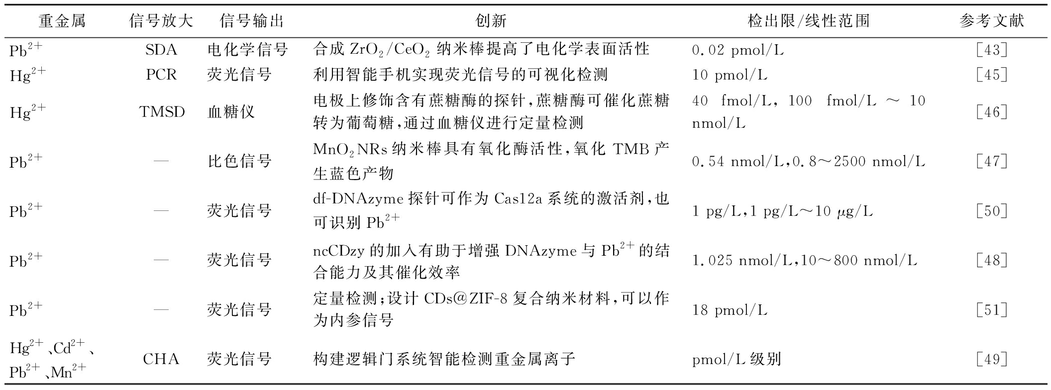 重金属信号放大信号输出创新检出限/线性范围参考文献Pb2+SDA电化学信号合成ZrO2/CeO2纳米棒提高了电化学表面活性0.02 pmol/L[43]Hg2+PCR荧光信号利用智能手机实现荧光信号的可视化检测10 pmol/L[45]Hg2+TMSD血糖仪电极上修饰含有蔗糖酶的探针,蔗糖酶可催化蔗糖转为葡萄糖,通过血糖仪进行定量检测40 fmol/L,100 fmol/L~10 nmol/L[46]Pb2+—比色信号MnO2NRs纳米棒具有氧化酶活性,氧化TMB产生蓝色产物0.54 nmol/L,0.8~2500 nmol/L[47]Pb2+—荧光信号df-DNAzyme探针可作为Cas12a系统的激活剂,也可识别Pb2+1 pg/L,1 pg/L~10 μg/L[50]Pb2+—荧光信号ncCDzy的加入有助于增强DNAzyme与Pb2+的结合能力及其催化效率1.025 nmol/L,10~800 nmol/L[48]Pb2+—荧光信号定量检测;设计CDs@ZIF-8复合纳米材料,可以作为内参信号18 pmol/L[51]Hg2+、Cd2+、Pb2+、Mn2+CHA荧光信号构建逻辑门系统智能检测重金属离子pmol/L级别[49]