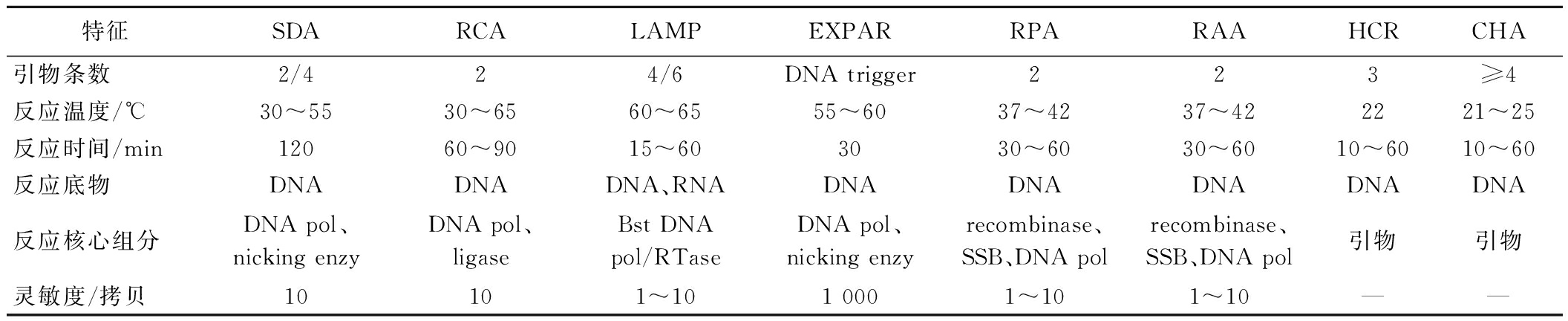 PCR技术通常应用于实验室检测中,为了满足现场检验的需求,操作简单、快捷、灵敏度高的等温扩增技术逐渐被广泛应用。环介导等温扩增(loop-mediated isothermal amplification, LAMP)技术是针对靶序列的6个位置设计4~6条特异性引物,利用链置换DNA聚合酶(Bst DNA polymerase)的活性进行扩增,扩增后首先形成哑铃状结构,哑铃状结构作为起始结构引发循环扩增[13]。该方法具有较高的特异性和灵敏度,但对引物的设计要求比较高,且容易产生假阳性。重组酶聚合酶扩增(recombinase polymerase amplification, RPA)技术是利用重组酶、单链DNA结合蛋白(single-stranded DNA-binding protein, SSB)和链置换DNA聚合酶进行扩增。其中重组酶引导引物结合dsDNA,链置换DNA聚合酶引发扩增,SSB稳定置换的单链。该方法引物设计简单,在37 ℃下就能发生反应,正逐渐成为现场检测的主流方法。其他等温扩增技术大多也是利用常温条件下能够扩增的聚合酶,同时使用有置换功能的重组酶或者形成特殊的结构来实现对靶序列的指数扩增。表3中总结了常见的等温扩增技术,包括链置换扩增(strand displacement amplification, SDA)技术、滚环扩增(rolling circle amplification, RCA)技术、指数式扩增(exponential amplification, EXPAR)技术、重组酶辅助扩增(recombinase aided amplification, RAA)技术、杂交链式反应(hybridization chain reaction, HCR)、催化发卡组装反应(catalytic hairpin assembly, CHA)。