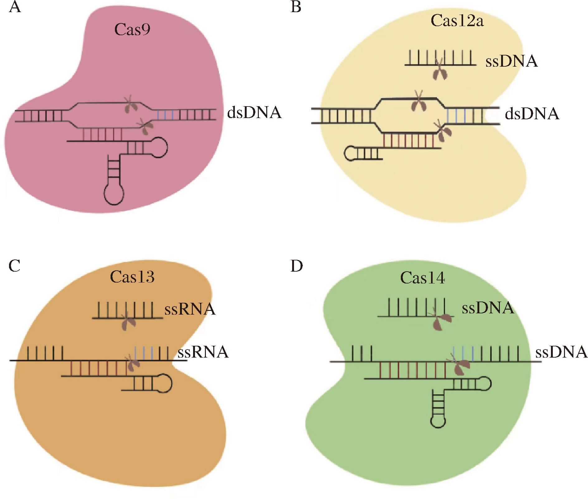 图3 Cas9、Cas12a、Cas13和Cas14的干扰机制