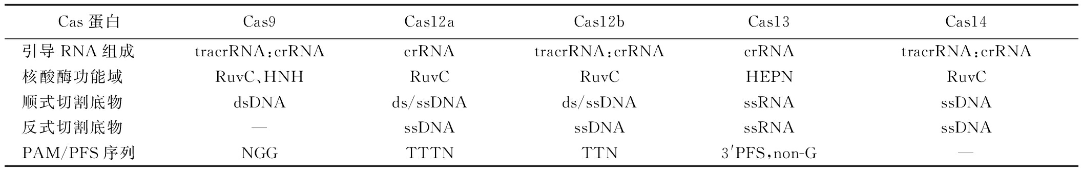 根据最近新的分类系统,CRISPR/Cas系统分为两大类:Ⅰ类和Ⅱ类。Ⅰ类CRISPR/Cas系统是由多种Cas蛋白组成的多亚基效应复合物构成。Ⅱ类CRISPR/Cas系统则由单个Cas蛋白组成的效应复合物构成,是基因组编辑应用的主要工具[9]。在Ⅱ类CRISPR/Cas系统中,Cas9、Cas12、Cas13和Cas14蛋白常用于核酸检测技术,这些蛋白的功能特征和干扰机制详见表1和图3。