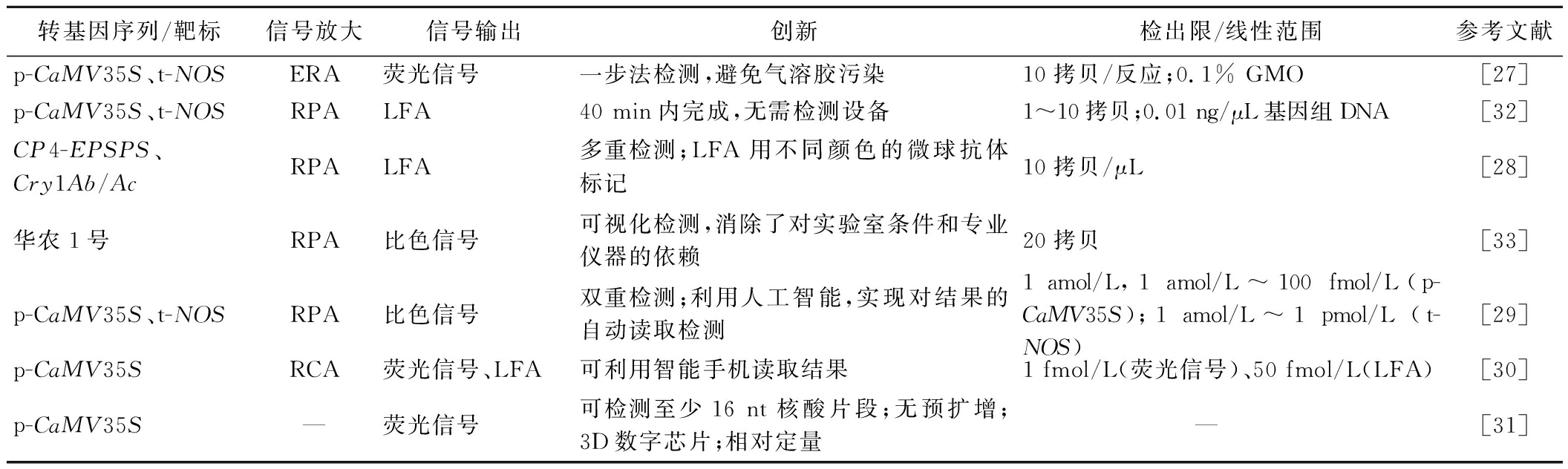 转基因序列/靶标信号放大信号输出创新检出限/线性范围参考文献p-CaMV35S、t-NOSERA荧光信号一步法检测,避免气溶胶污染10拷贝/反应;0.1% GMO[27]p-CaMV35S、t-NOSRPALFA40 min内完成,无需检测设备1~10拷贝;0.01 ng/μL基因组DNA[32]CP4-EPSPS、Cry1Ab/AcRPALFA多重检测;LFA用不同颜色的微球抗体标记10拷贝/μL[28]华农1号RPA比色信号可视化检测,消除了对实验室条件和专业仪器的依赖20拷贝[33]p-CaMV35S、t-NOSRPA比色信号双重检测;利用人工智能,实现对结果的自动读取检测1 amol/L,1 amol/L~100 fmol/L(p-CaMV35S);1 amol/L~1 pmol/L (t-NOS)[29]p-CaMV35SRCA荧光信号、LFA可利用智能手机读取结果1 fmol/L(荧光信号)、50 fmol/L(LFA)[30]p-CaMV35S—荧光信号可检测至少16 nt核酸片段;无预扩增;3D数字芯片;相对定量 —[31]
