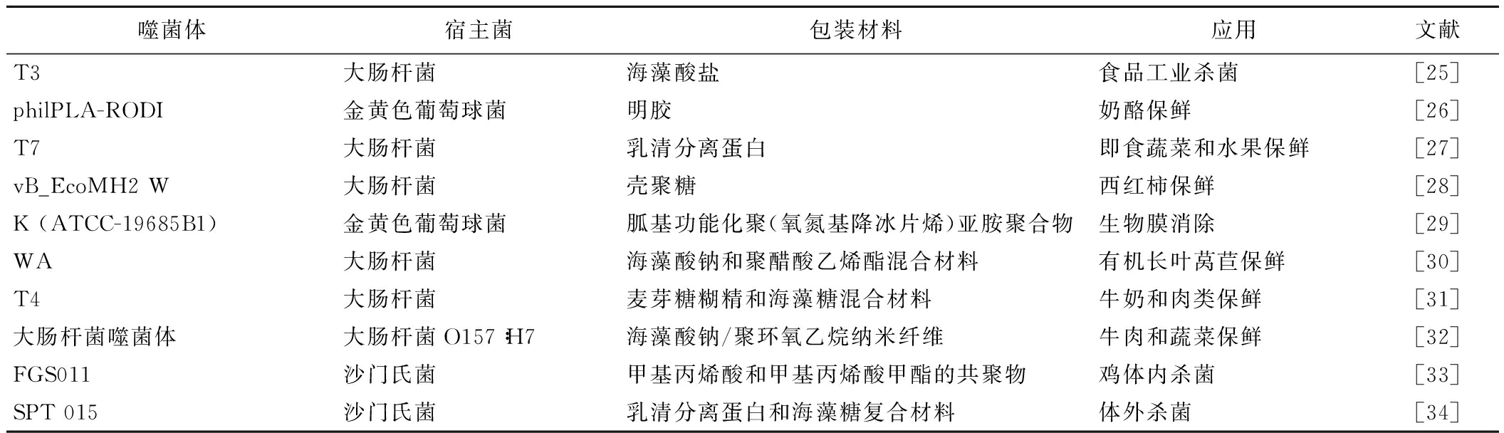 噬菌体宿主菌包装材料应用文献T3大肠杆菌海藻酸盐食品工业杀菌[25]philPLA-RODI金黄色葡萄球菌明胶奶酪保鲜[26]T7大肠杆菌乳清分离蛋白即食蔬菜和水果保鲜[27]vB_EcoMH2 W大肠杆菌壳聚糖西红柿保鲜[28]K (ATCC-19685B1)金黄色葡萄球菌胍基功能化聚(氧氮基降冰片烯)亚胺聚合物生物膜消除[29]WA大肠杆菌海藻酸钠和聚醋酸乙烯酯混合材料有机长叶莴苣保鲜[30]T4大肠杆菌麦芽糖糊精和海藻糖混合材料牛奶和肉类保鲜[31]大肠杆菌噬菌体大肠杆菌O157∶H7海藻酸钠/聚环氧乙烷纳米纤维牛肉和蔬菜保鲜[32]FGS011沙门氏菌甲基丙烯酸和甲基丙烯酸甲酯的共聚物鸡体内杀菌[33]SPT 015沙门氏菌乳清分离蛋白和海藻糖复合材料体外杀菌[34]