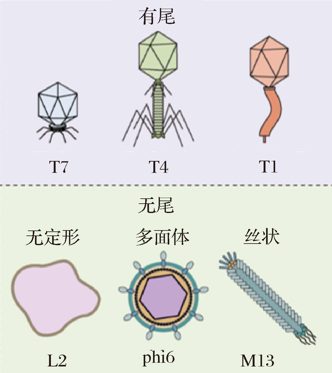噬菌体的数量是细菌的10倍,据估计,噬菌体种群由大约1031个噬菌体颗粒组成,是地球上最丰富的实体[5-6]。噬菌体是一个异质性很强的类群,不仅可以根据其核酸组成(dsDNA、ssDNA、dsRNA和ssRNA)进行分类,还可以根据其形态结构进行分类(如图1所示)[7]。大多数噬菌体是尾状(约96%),属于尾状目。尾状噬菌体被进一步划分为短尾(podoviridae)、长尾不收缩(siphoviridae)和收缩尾(myoviridae)3个家族[8]。但是,由于遗传多样性高,收缩尾科的一些噬菌体已被重新分类为2个新的家族——阿克曼病毒科(Ackermannviridae)和赫勒利病毒科(Herelleviridae)。