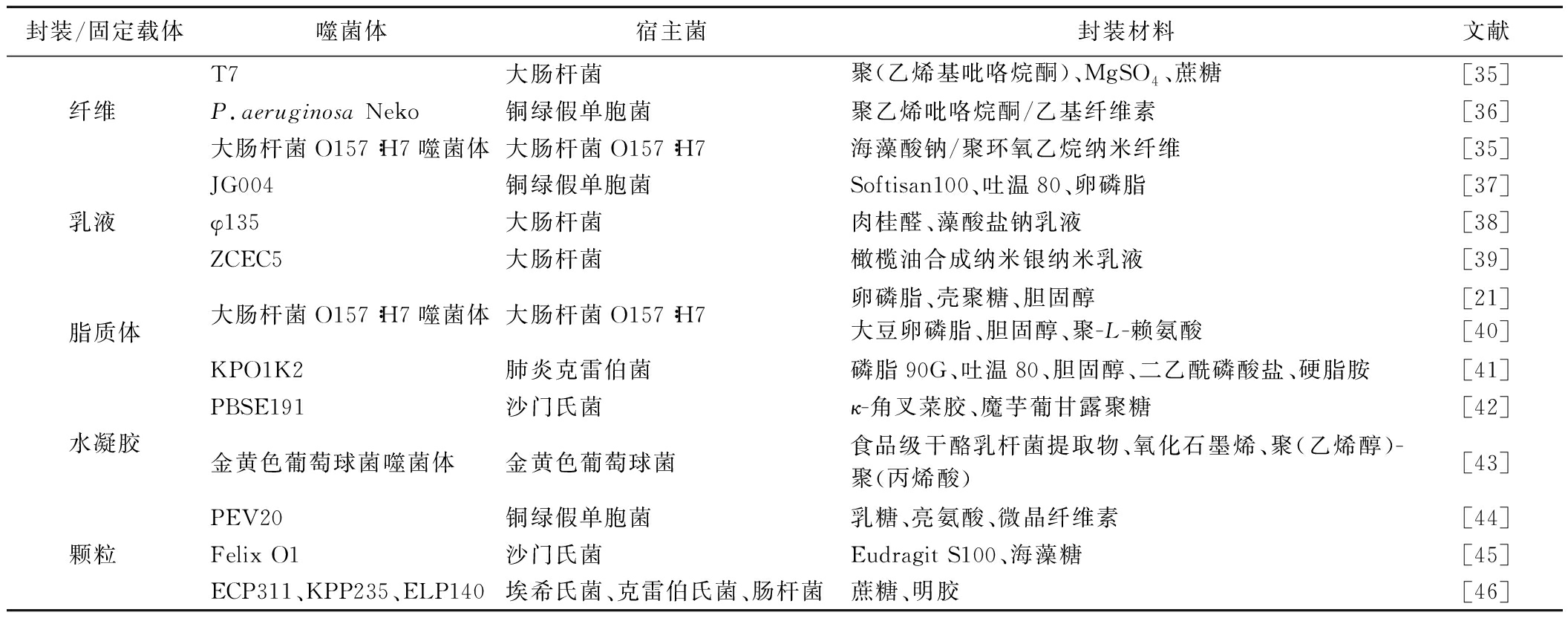 封装/固定载体噬菌体宿主菌封装材料文献纤维 T7大肠杆菌聚(乙烯基吡咯烷酮)、MgSO4、蔗糖[35]P.aeruginosa Neko铜绿假单胞菌聚乙烯吡咯烷酮/乙基纤维素[36]大肠杆菌O157∶H7噬菌体大肠杆菌O157∶H7海藻酸钠/聚环氧乙烷纳米纤维[35]乳液 JG004铜绿假单胞菌Softisan100、吐温80、卵磷脂[37]φ135大肠杆菌肉桂醛、藻酸盐钠乳液[38]ZCEC5大肠杆菌橄榄油合成纳米银纳米乳液[39]脂质体大肠杆菌O157∶H7噬菌体大肠杆菌O157∶H7卵磷脂、壳聚糖、胆固醇大豆卵磷脂、胆固醇、聚-L-赖氨酸[21][40]KPO1K2肺炎克雷伯菌磷脂90G、吐温80、胆固醇、二乙酰磷酸盐、硬脂胺[41]水凝胶PBSE191沙门氏菌κ-角叉菜胶、魔芋葡甘露聚糖[42]金黄色葡萄球菌噬菌体金黄色葡萄球菌食品级干酪乳杆菌提取物、氧化石墨烯、聚(乙烯醇)-聚(丙烯酸)[43]颗粒 PEV20铜绿假单胞菌乳糖、亮氨酸、微晶纤维素[44]Felix O1沙门氏菌Eudragit S100、海藻糖[45]ECP311、KPP235、ELP140埃希氏菌、克雷伯氏菌、肠杆菌蔗糖、明胶[46]