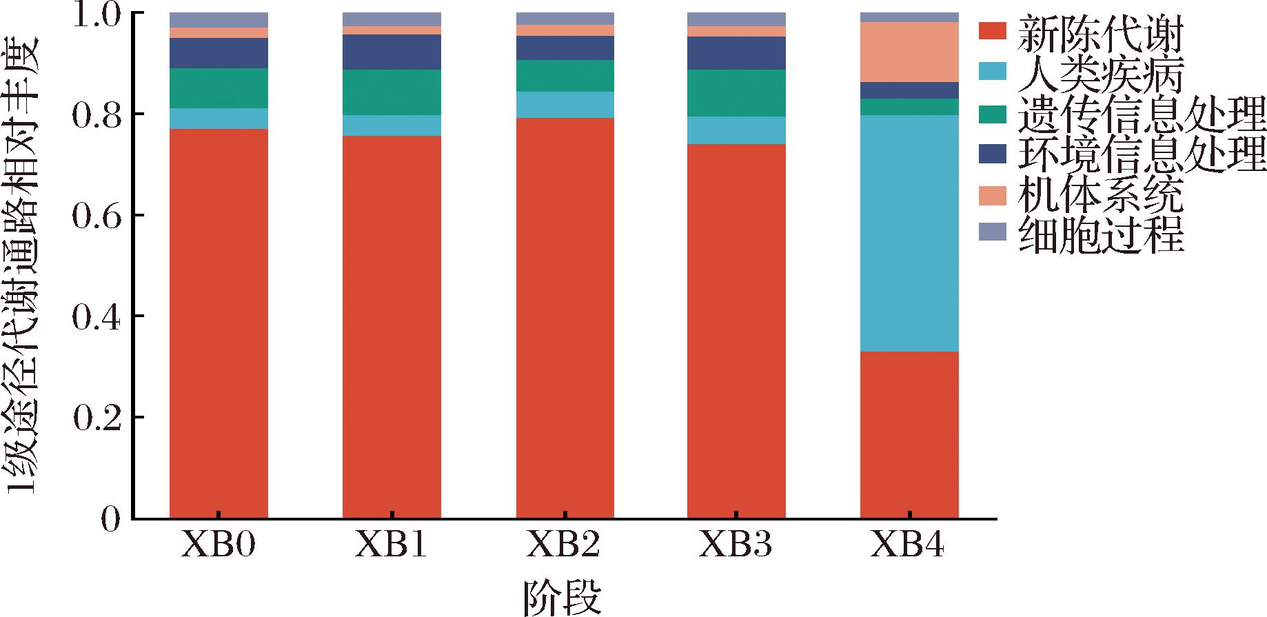 将测序数据映射到KEGG数据库,通过逐层解析代谢通路,可以揭示不同风干贮藏阶段低钠腊肉中微生物的功能基因分布差异以及代谢机制。图6展示了1级代谢通路分布情况,在腊肉贮藏的过程中,“新陈代谢”通路是最主要的代谢通路,前4个月的占比稳定为73.96%~79.21%,但在第4个月却急剧下降至33.03%。同时,“人类疾病”通路在贮藏前中期(第0~3个月)的占比并不高(4.14%~5.60%);而在第4个月,占比突然上升至46.77%,与致病菌(如艰难拟梭菌)的异常增殖密切相关,表明贮藏后期存在显著食品安全风险。钠盐可以通过降低食品的水分活度、在微生物细胞内外形成渗透压的方式抑制腐败菌和致病菌的生长。然而,低钠配方导致腊肉基质水分活度升高及渗透压降低,使得致病菌的细胞膜稳定性增强,致病菌更易黏附到腊肉表面形成生物膜,而生物膜可以为致病菌提供物理屏障,保护其免受脱水、pH波动及残留防腐剂的杀伤,致病菌得以繁殖,因此第4个月的“人类疾病”代谢通路占比上升。