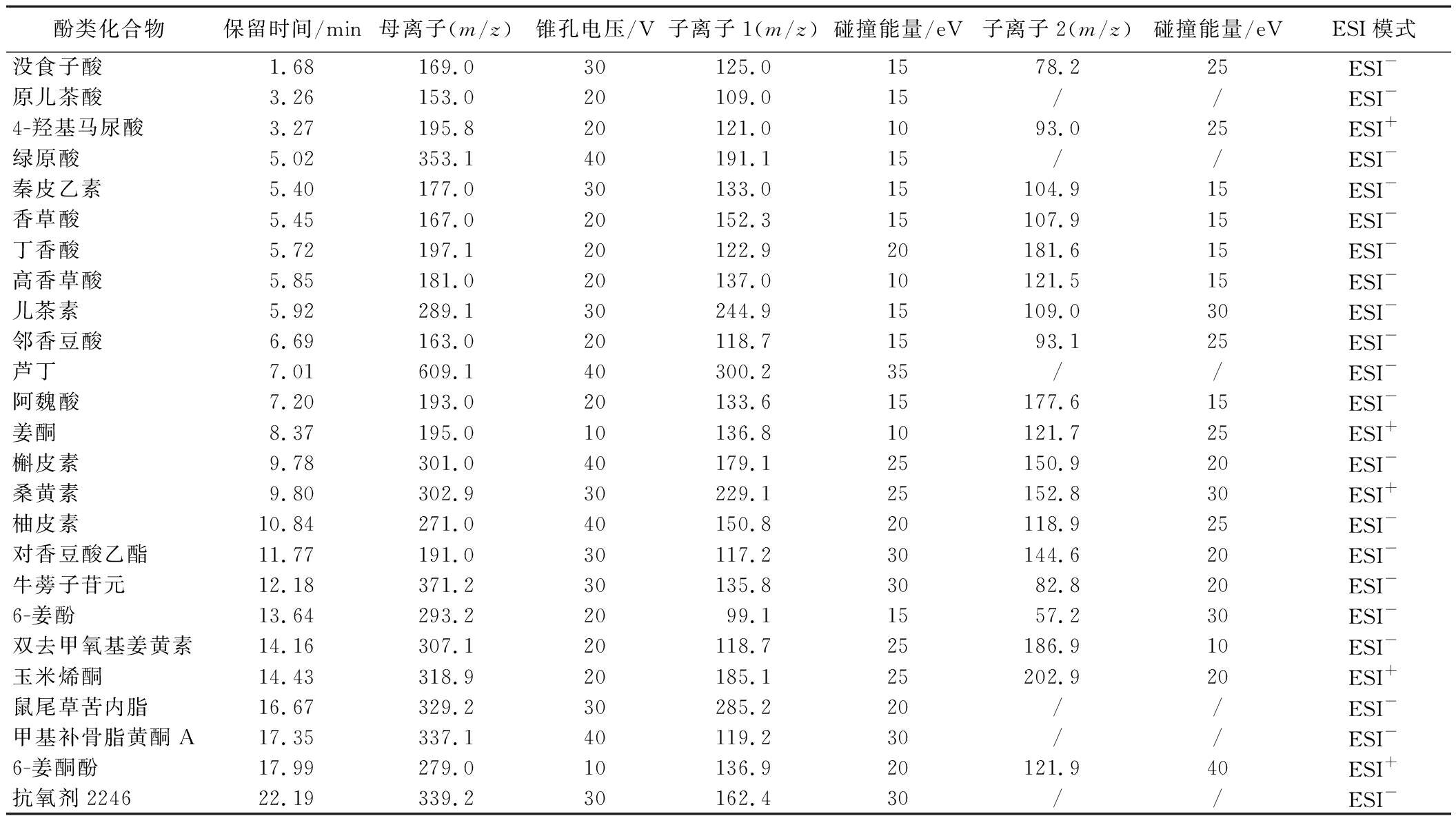 通过UPLC-MS/MS结合Masslynx软件对25种酚类化合物质谱参数进行优化。首先确定酚类化合物的正、负离子模式,选择响应最强的母离子-子离子对;并在最优母离子-子离子对的基础下,优化锥孔电压(10~40 V)、碰撞能量(5~40 eV)等质谱参数。