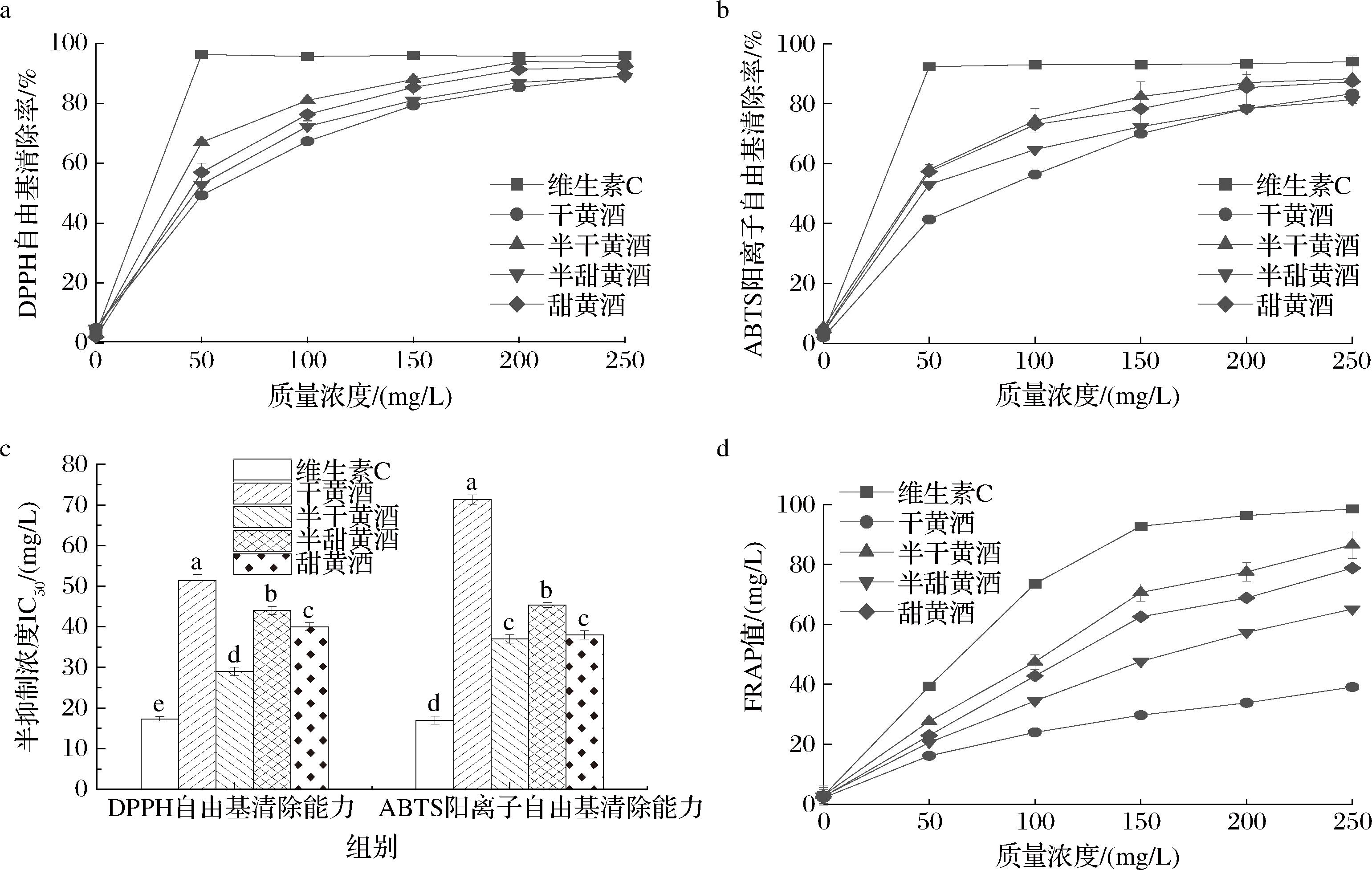 如图3-a和图3-c所示,不同甜型黄酒均显示出对DPPH自由基的清除能力,其IC50为29.00~51.33 mg/L。IC50越低,表示抗氧化能力越强。具体来说,半干黄酒中的酚类化合物在清除DPPH自由基方面表现最为出色,而干黄酒则相对较弱。此外,半甜黄酒和甜黄酒在清除DPPH自由基的能力上没有显著差异(P>0.05)。图3中ABTS与DPPH法抗氧化清除率结果相一致,均表现为半干黄酒在清除自由基方面最佳,而干黄酒的表现则相对较低,半甜黄酒和甜黄酒则处于中等水平。图3-d进一步揭示了总还原能力随酚类化合物浓度增加而变化的趋势。当酚类化合物质量浓度达到250 mg/L时,维生素C的FRAP值最高,为98.55 mg/L。在4种黄酒中,半干黄酒的FRAP值最高,为85.83 mg/L,其次是甜黄酒(78.90 mg/L)、半甜黄酒(65.10 mg/L),而干黄酒的FRAP值最低,为39.01 mg/L。综合分析,除阳性对照维生素C外,半干黄酒在抗氧化活性上的表现最为突出,而干黄酒的抗氧化活性相对较弱,半甜黄酒和甜黄酒则处于中等水平。这些发现说明不同甜型黄酒在总酚含量几乎一致的情况下,是酚类化合物不同的组成导致了不同的抗氧化能力。