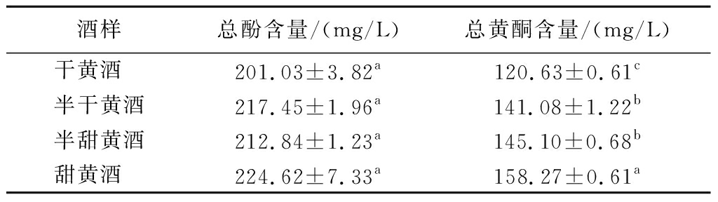 酒样总酚含量/(mg/L)总黄酮含量/(mg/L)干黄酒 201.03±3.82a120.63±0.61c半干黄酒217.45±1.96a141.08±1.22b半甜黄酒212.84±1.23a145.10±0.68b甜黄酒 224.62±7.33a158.27±0.61a