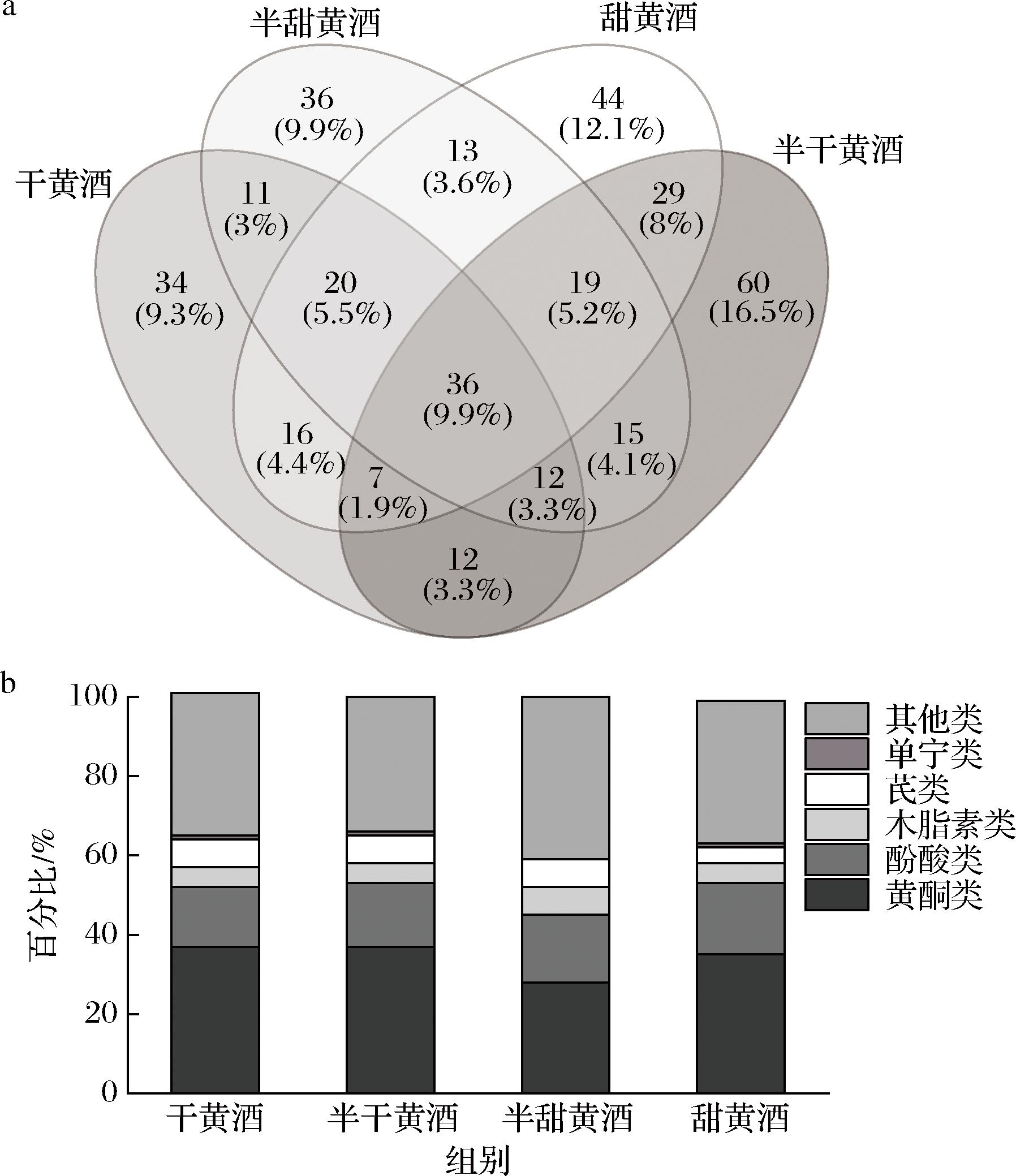 图1 不同甜型黄酒中酚类化合物个数的韦恩图分析及类型分布