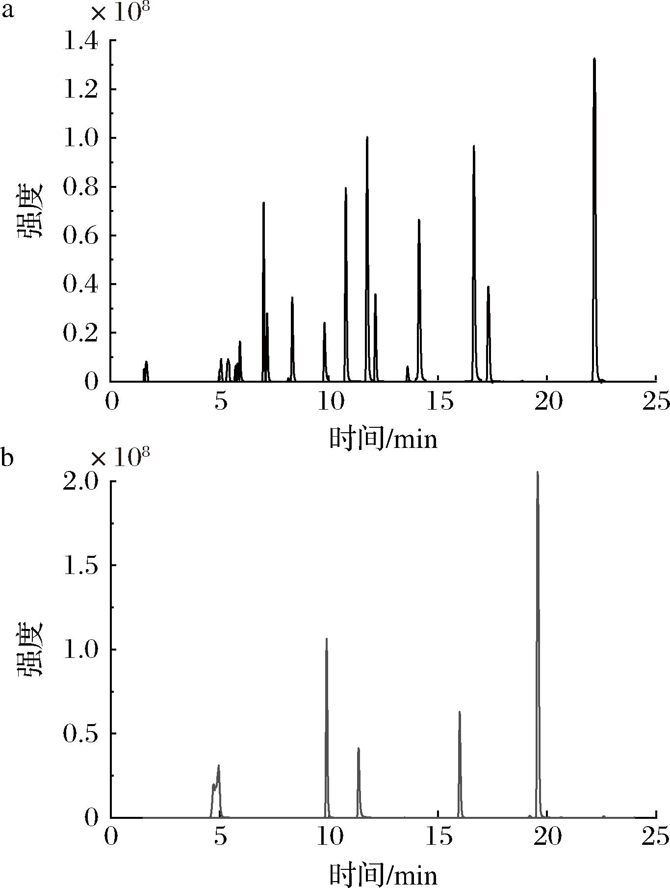 所有分析重复3次以上,结果表示为“平均值±标准差”。使用Masslyxn V 4.2软件对总离子流图进行分析,使用Origin 2021软件进行数据可视化。使用SPSS 26.0软件对数据进行统计学分析,多重比较采用单因素方差分析,事后多重检验采用Duncan检验(方差齐)和Tamhane检验(方差不齐),P<0.05被认为在统计学上差异显著。