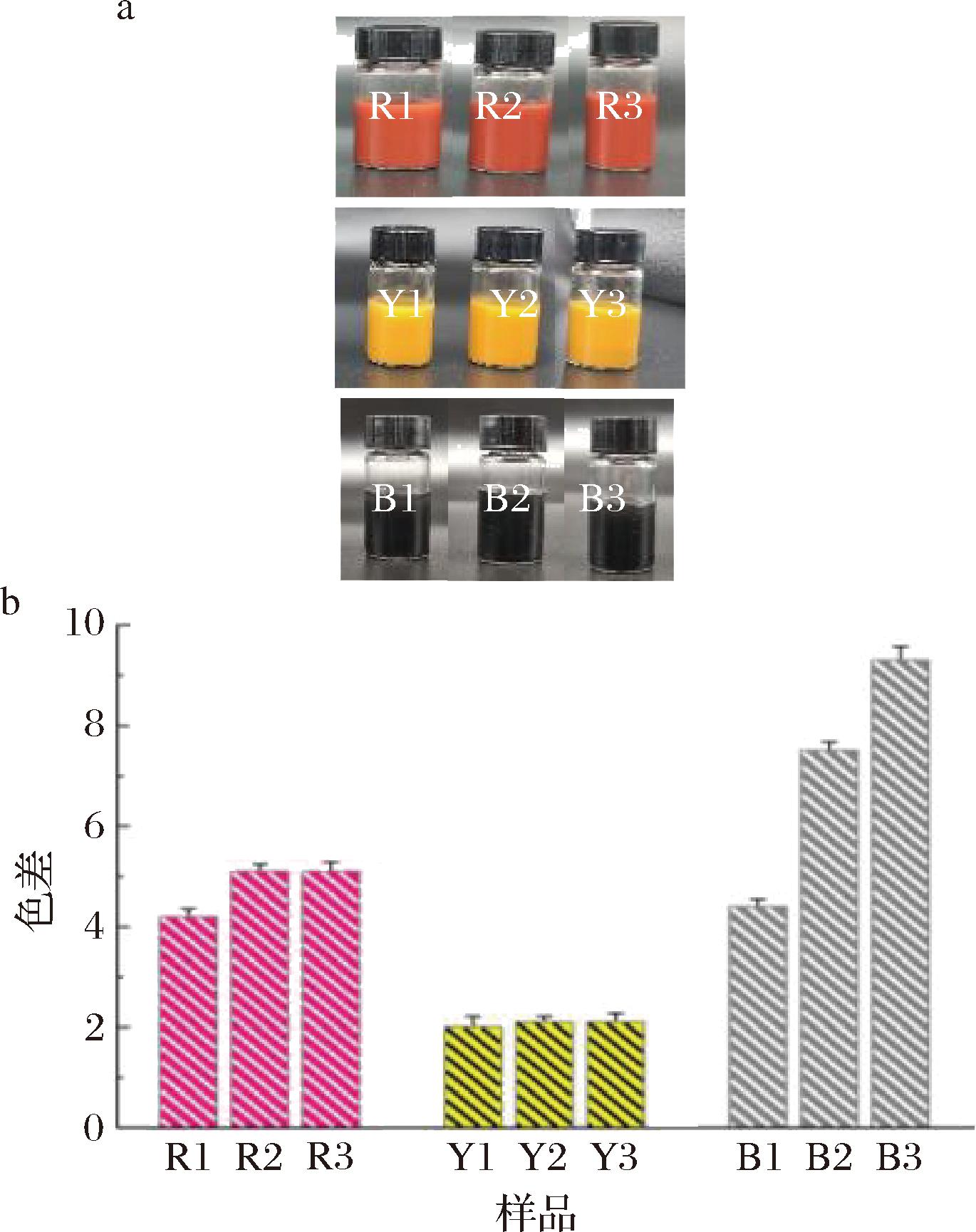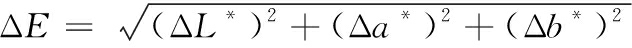 式中:ΔE代表色差;ΔL*、Δa*、Δb*为被测样品与参考样品(R0、Y0、B0)之间L*、a*和b*的差值。其中ΔE<3:没有明显的差异;3<ΔE<6:非常微小的差异;6<ΔE<9:相当明显的差异;9<ΔE<12:显著的差异;ΔE>12:不同的颜色。