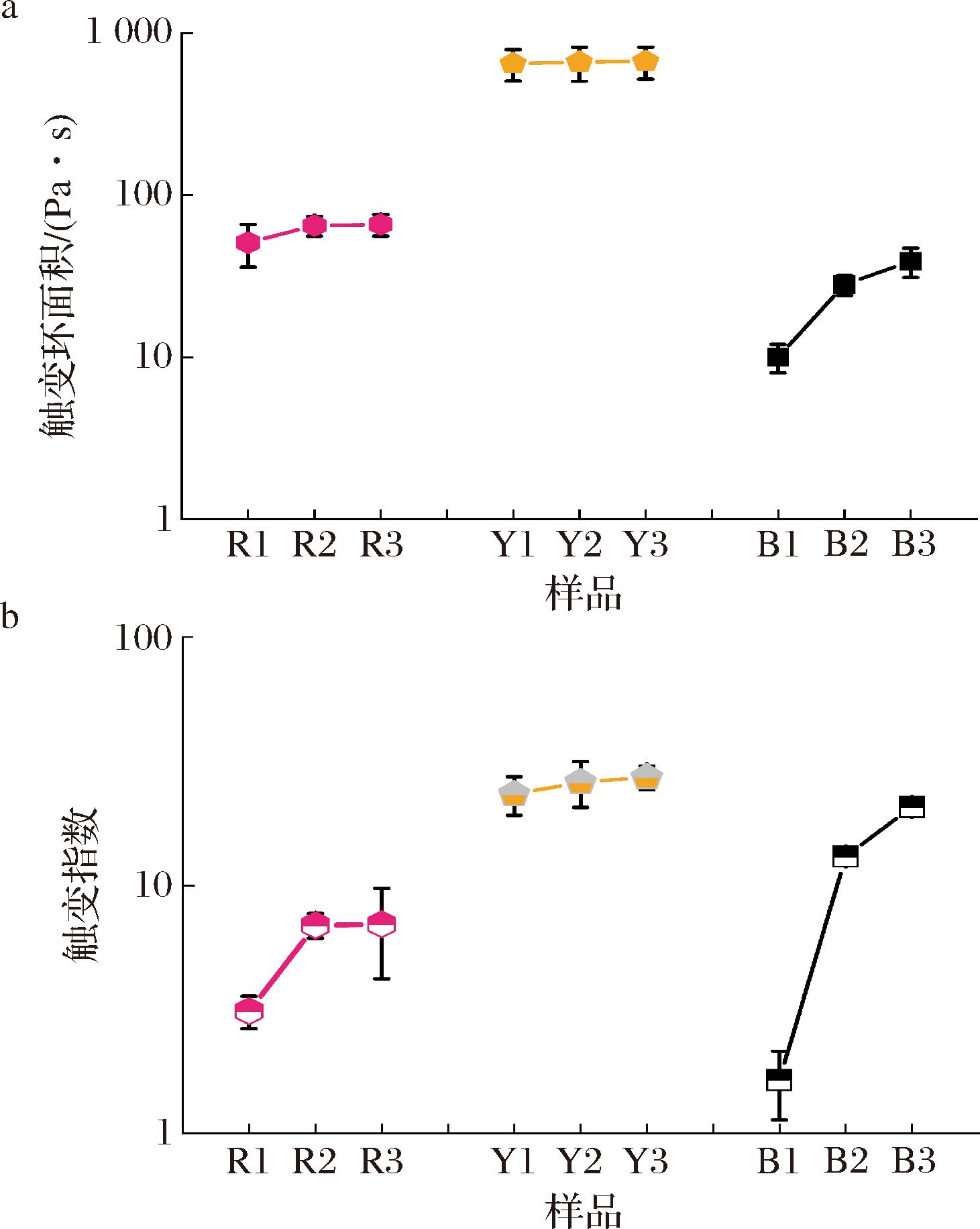 体系触变环的面积越大,触变性越好[13];触变指数越大,触变性也越好[14]。图5-a和图5-b分别展现了样品的触变环面积和触变指数。对于明胶/氧化铁红基样品,R2的触变环面积和触变指数高于R1,这可能是因为随着吐温80含量的增加,氧化铁红色料分散较好,体系结构较为稳定,在外力作用变形后易恢复,因此触变性较高;随着吐温80的添加,R3的触变环面积和触变指数没有明显增加,可能是因为吐温80含量为3.3%时,体系中色料已经被充分分散,继续添加吐温80(5.0%)对触变性的影响不大。对于明胶/氧化铁黄基样品,不论吐温80的含量如何,样品的触变环面积和触变指数均较高,说明在低含量的吐温80下(1.6%),氧化铁黄已经被充分分散,样品触变性较好。对于明胶/氧化铁黑基样品,随着吐温80的添加,B1、B2、B3的触变环面积和触变指数明显提高,尤其是B3面积和指数最大,说明B3的触变性最好,可能是因为高浓度吐温80才能有效地分散氧化铁黑色料,从而形成结构稳定且触变性高的体系。