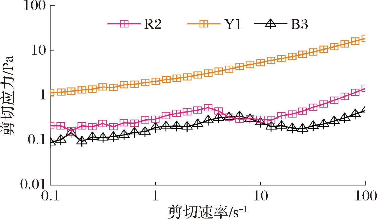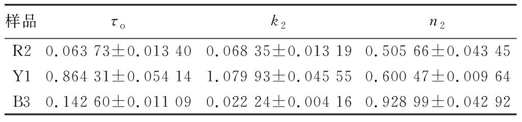 明胶/氧化铁基样品的剪切应力-速率曲线如图7所示,其Herschel-Bulkley拟合结果见表2。表2中n2均小于1,进一步说明样品为假塑性流体[15],与图3和表1结果一致。τ0为屈服值,表示体系开始流动所需达到与超过的临界应力值,可表征体系的结构强度[16];k2表示流体在受到外部剪切应力作用下的抵抗能力及稠度。结合表2,Y1的τ0、k2值最大,说明Y1相比于R2和B3具有较强的内部结构强度和较高的黏度,这可能是因为氧化铁黄色料可以与明胶、甘油和吐温80之间产生了较强的相互作用,从而形成结合更加紧密和稳定的三维网状结构。所以,Y1需要更大的屈服应力才能够使体系发生流变形变,与图2~图6性能结果一致。