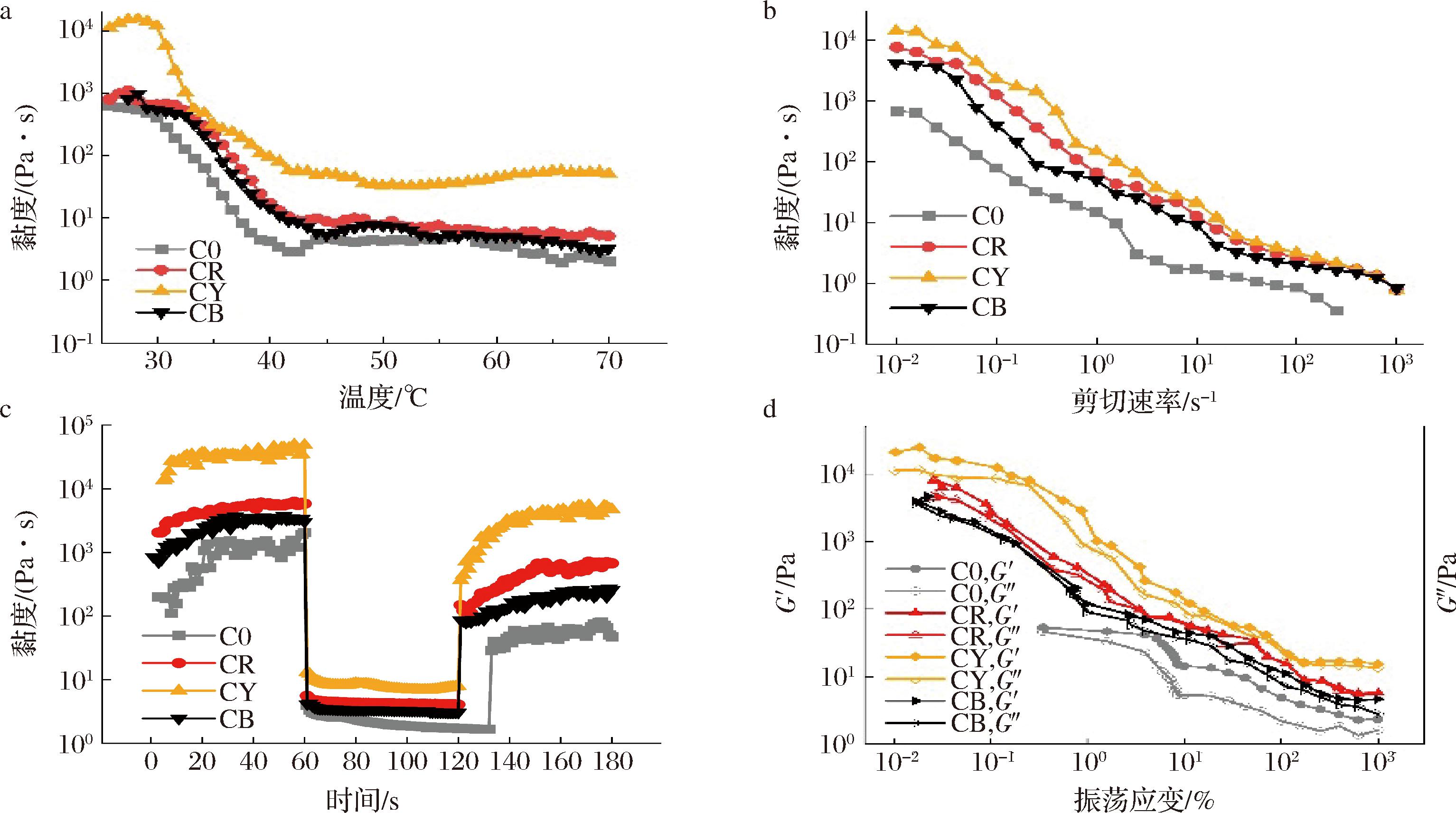 图8为巧克力样品C0、CR、CY、CB的流变学测试结果。由图8-a可知,随着温度升高至45 ℃后,巧克力黏度都降低,均由固体变为液体,因此选择50 ℃进行后面的测试;由图8-b可知,巧克力样品均具有剪切稀化的特性,有利于实际加工生产;由图8-c可知,C0、CR、CY、CB的恢复率分别为27.68%、31.56%、31.95%和30.75%,巧克力样品均具有一定的触变性,尤其是着色体系可以提高白色巧克力的恢复率和增强其网络结构重建能力;图8-d展示了巧克力样品在应变作用下,模量均降低、网络结构弹性降低,趋势一致。其温敏固-液性、剪切稀化特性、网络结构重建能力、弹性等性质,表明所有巧克力样品具有较优的加工性、特殊成型性(如3D打印)和应用性。