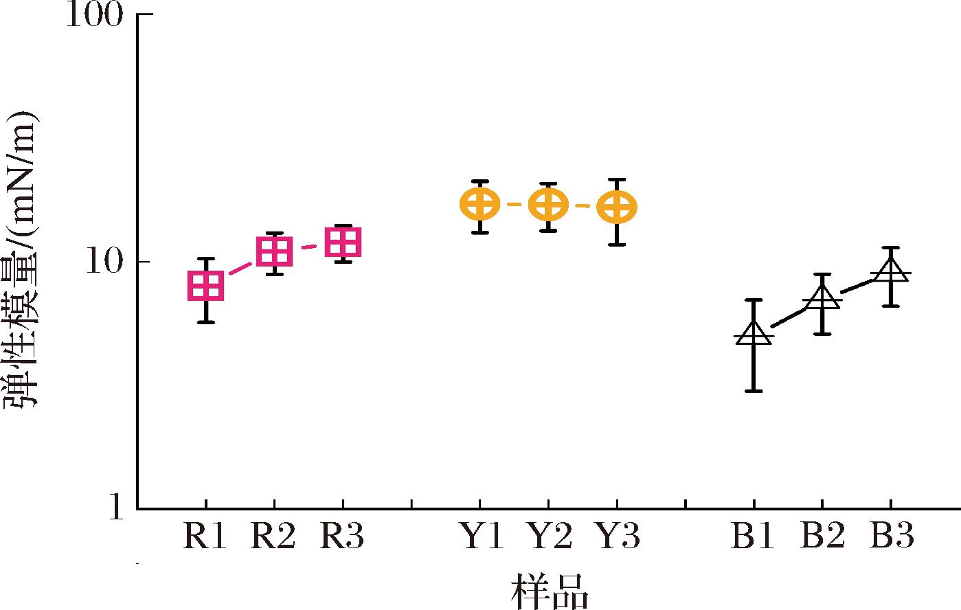 膨胀弹性模量(图6)可表示体系在形变过程中储存的能量,可反映体系的结构强度和抗形变能力。对于明胶/氧化铁红基样品,R2的膨胀弹性模量大于R1,归因于吐温80的含量增加,促进了氧化铁红色料的分散,样品更加稳定,因此膨胀弹性模量得到提高;当吐温80继续添加时,模量改变不大,可能是吐温80含量为3.3%时,氧化铁红色料已经足够稳定,吐温80对膨胀弹性模量的影响较小。对于明胶/氧化铁黄基样品,Y1、Y2、Y3的弹性模量差距不大,可能是吐温80的含量为1.6%时(Y1)就能够较好分散氧化铁黄色料,具有较高的膨胀弹性模量和体系稳定性。对于明胶/氧化铁黑基样品,随着吐温80的添加,B1、B2、B3的膨胀弹性模量不断增加,特别是B3(吐温80含量为5.0%),具有最高的弹性模量,具有较高的结构强度和抗形变能力,稳定性最好。