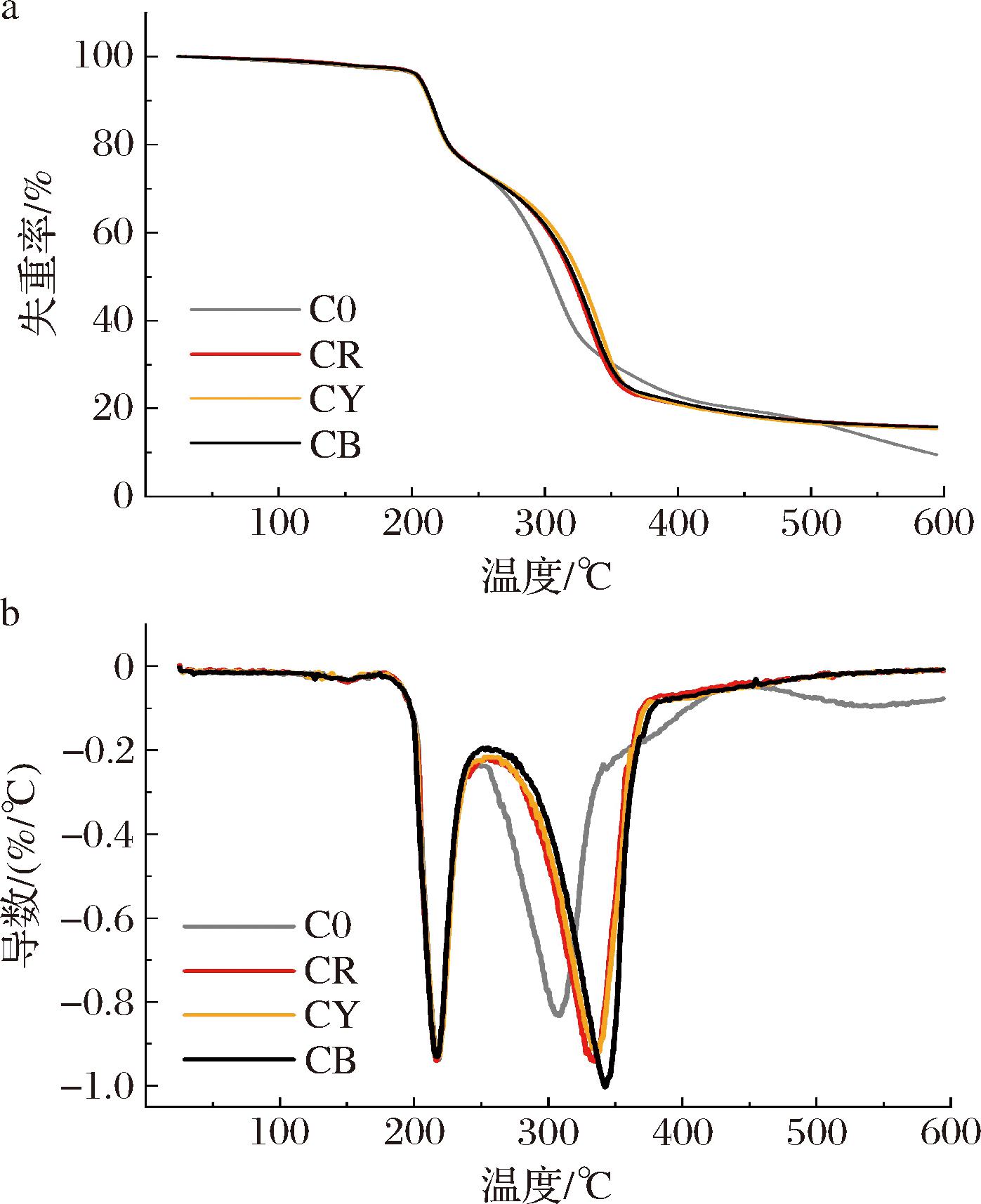 热重分析技术可探究白巧克力样品的热稳定性[21]。图11-a和图11-b分别为白巧克力样品的TGA曲线和DTG曲线。由图11-a的TGA曲线可得,不论温度在300 ℃或近600 ℃时,C0均比CR、CY、CB具有更高的失重率,CR、CY、CB表现出较高的热稳定性。由图11-b的DTG曲线可知,C0、CR、CY、CB均在160 ℃和220 ℃左右具有第一阶段和第二阶段热降解峰;在大于300 ℃,具有第三阶段热降解峰,但此时CR(330 ℃)、CY(337 ℃)、CB(344 ℃)比C0(309 ℃)具有更高的热降解温度,进一步证明,明胶/氧化铁基样品可以提高白巧克力的热稳定性,可能的原因是明胶/氧化铁基着色体系中的明胶、甘油、吐温80与白巧克力中的各组分相互作用,促进氧化铁色料的均匀分散,增强白巧克力的网络结构,促使降解温度上升,提升白巧克力样品的热稳定性。
