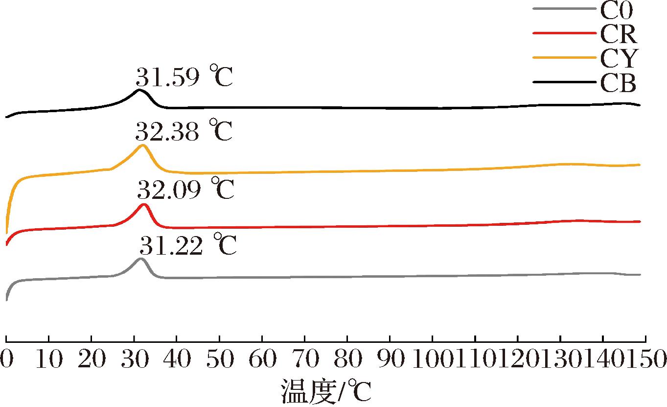 DSC可以评估白巧克力的热性能[22]、品质和加工性能。图12为巧克力样品的DSC曲线,熔融点显示为一个明显的吸热峰(正峰),熔融温度在30~33 ℃,这个峰值对应于巧克力从固态到液态的转变。总体而言,着色体系对巧克力熔融温度影响较小,白色巧克力和着色巧克力样品的熔融温度几乎相同,或者着色巧克力样品(CR和CY)熔融温度仅稍微提高,这主要归因于着色体系的添加量比较低(0.2%,质量分数),因此其对白巧克力熔融温度影响较小。