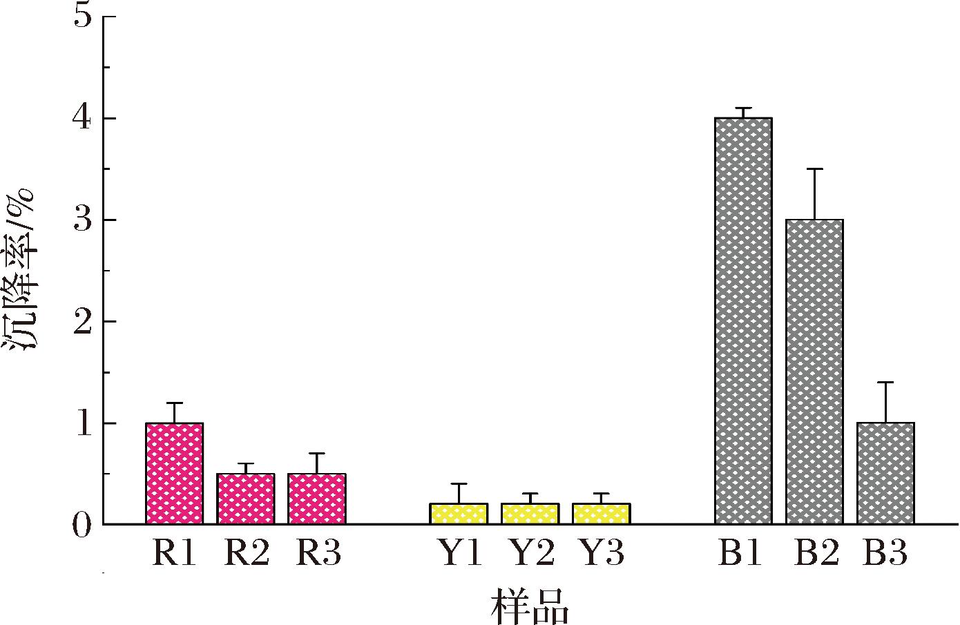 具体而言,对于明胶/氧化铁红基样品,当吐温80增加到3.3%(R2)时,沉降率明显下降,但当吐温80继续增加时,沉淀率几乎保持不变;对于明胶/氧化铁黄基样品,吐温80对体系的沉降率影响不大,Y1、Y2、Y3的沉降率都比较低,吐温80含量为1.6%时,氧化铁黄色料在体系中的分散程度就能够达到较好效果,与CIElab结果一致;对于明胶/氧化铁黑基样品,随着吐温80含量增加(1.6%、3.3%、5.0%),B1、B2、B3沉降率明显下降,特别是B3(吐温80含量5.0%)的沉降率最低,说明此时吐温80含量可较好分散体系中的氧化铁黑色料。因此,R2、R3、Y1、Y2、Y3、B3沉淀率较低,吐温80可以促进色料在体系中分散和负载,并防止沉淀,有利于维持体系的稳定性;考虑到成本(吐温80用量),其中R2、Y1、B3的沉淀率低且整体较为稳定。