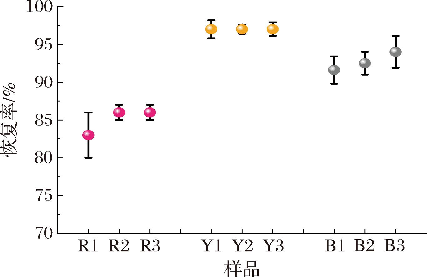 3ITT可用于评估和描述体系的内部结构[12]。如图4所示,对于明胶/氧化铁红基样品,R2的恢复率优于R1,这可能与吐温80的增加有关;吐温80的增加促进了各组分互作,形成较强的网络结构,从而促进了氧化铁红色料的分散,形成了较稳定的体系;在外力作用下,该体系的变形恢复率较好,能够较大程度上恢复其网络结构;当吐温80的含量继续增加时,R3的恢复率几乎不变,说明当吐温80含量为3.3%时(R2),氧化铁红基色料已经被充分分散,体系已经足够稳定(与图2一致)。对于明胶/氧化铁黄基样品,吐温80的含量对样品恢复率影响不大,Y1、Y2、Y3的恢复率几乎相同,均具有较高的网络结构重建性,可能当吐温80的含量为1.6%时,氧化铁黄色料分散性已经较好且体系已经较为稳定(图2)。对于明胶/氧化铁黑基样品,B1、B2、B3的恢复率随着吐温80的含量增加有明显上升,尤其是B3(吐温80含量5.0%),其恢复率最高,这说明该样品在受到剪切应力变形后恢复能力较好;这是因为当吐温80的含量为5.0%时,氧化铁黑可以被较好地负载和分散,色料粒子不容易发生聚集和沉淀,此时样品具有较好的结构重建能力,恢复率较高。