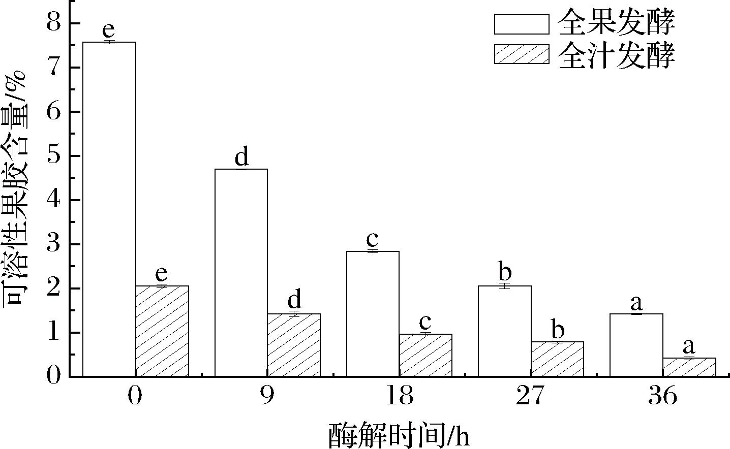 图3揭示了2种发酵方式对红枣发酵醪液中可溶性果胶含量的影响。从图3可以看出,2种发酵方式的发酵醪液中可溶性果胶含量在酶解过程中均表现出下降趋势。这是因为在酶的作用下,果胶发生了脱脂反应,脱去甲氧基,并随之产生了甲醇。在0 h时,全果发酵红枣发酵醪液中可溶性果胶含量为7.57%(相当于75.7 g/L),全汁发酵红枣发酵醪液中可溶性果胶含量为1.22%。经过36 h酶解后,全果全汁发酵醪液中可溶性果胶含量分别为1.42%、0.42%。