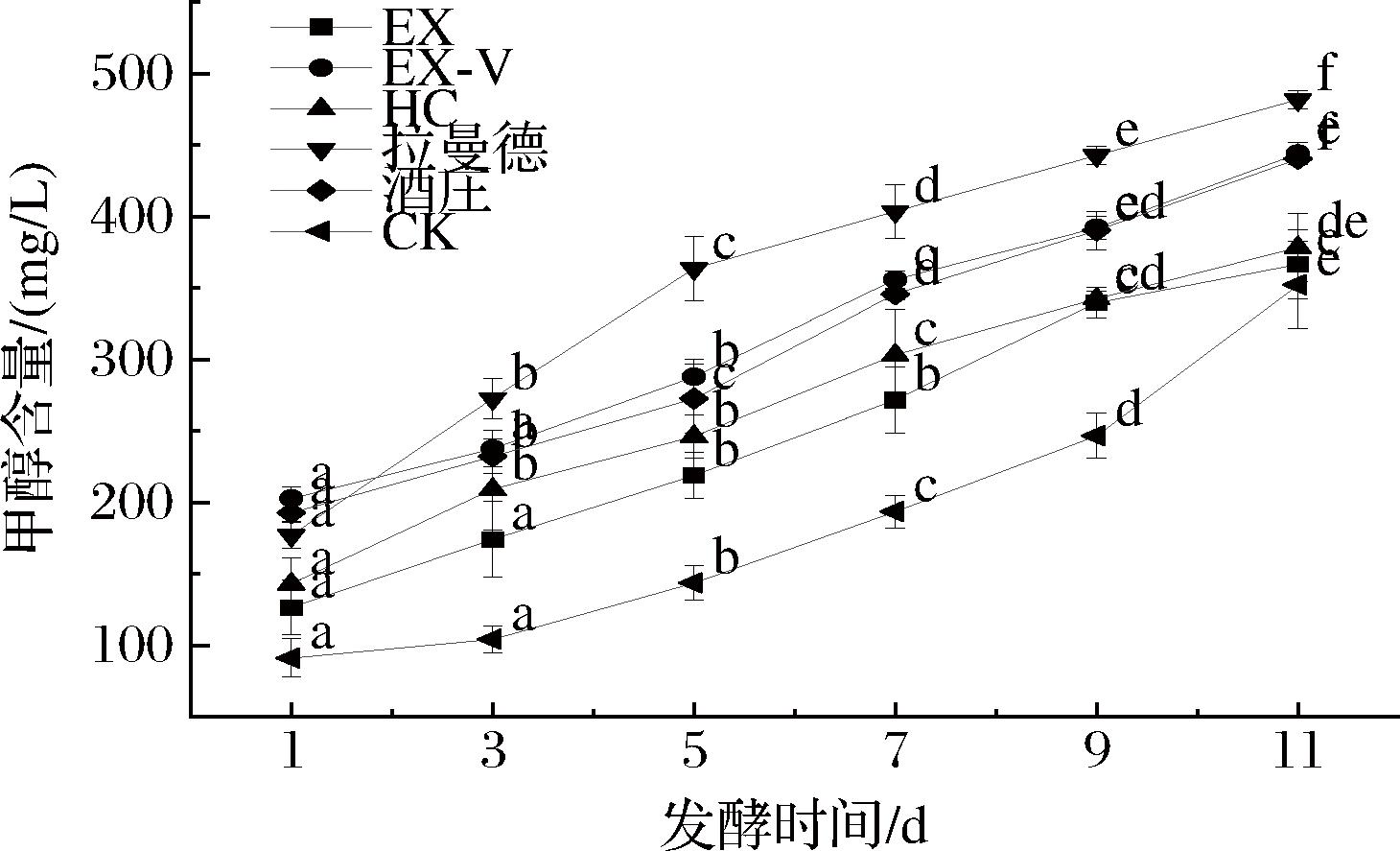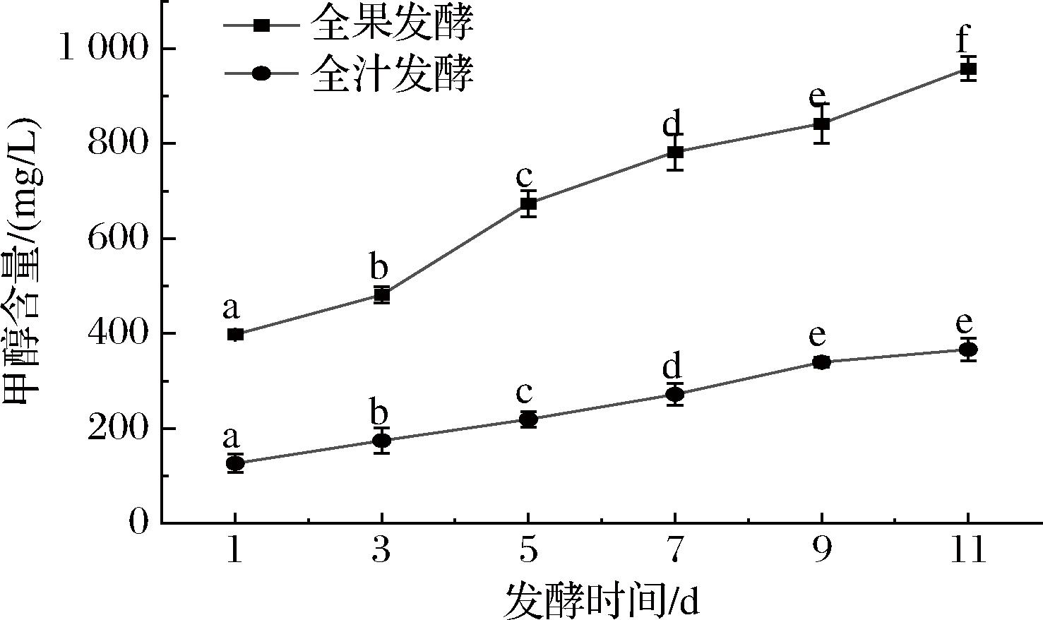 由图5可知,2种不同发酵方式发酵的红枣酒中,甲醇含量随发酵时间延长均呈上升趋势,发酵11 d时,全果发酵红枣酒甲醇含量为958.32 mg/L,全汁发酵红枣酒甲醇含量为366.44 mg/L。从发酵过程来看,在发酵前期,甲醇产生速度较快,可能是由于外加果胶酶酶解果胶,果胶水解产生甲醇。在酵母活跃代谢阶段,主要产生乙醇和其他醇类物质,此时甲醇的溶解性和挥发性强于其他阶段,甲醇易随其他醇类物质挥发,甲醇含量相比发酵前期和后期要少,生成速度较其他阶段慢。因此,选用全汁发酵作为最佳发酵方式。