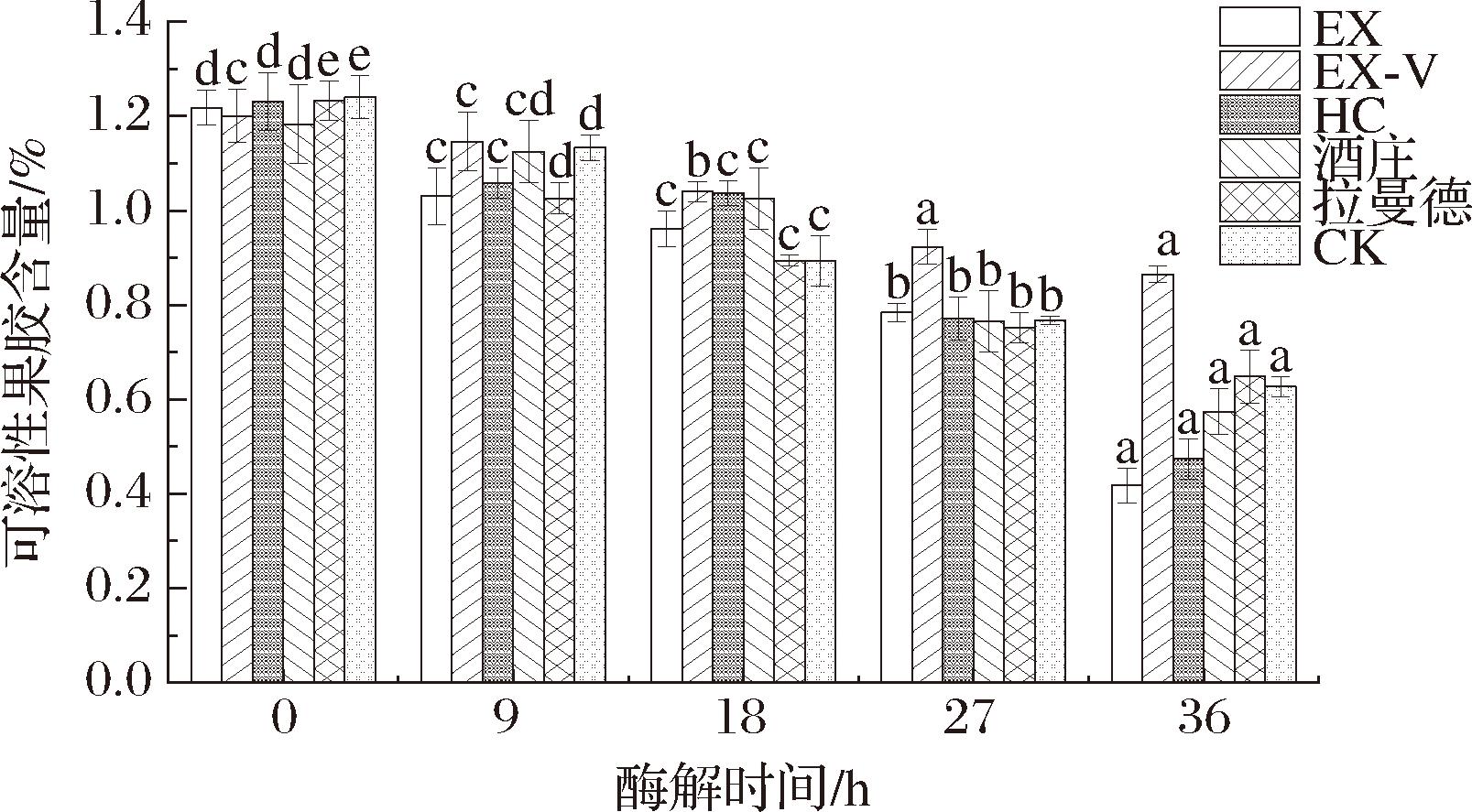 Fig.7 Changes in soluble pectin content during enzymatic digestion of fermented mash of jujube with different pectinase treatments