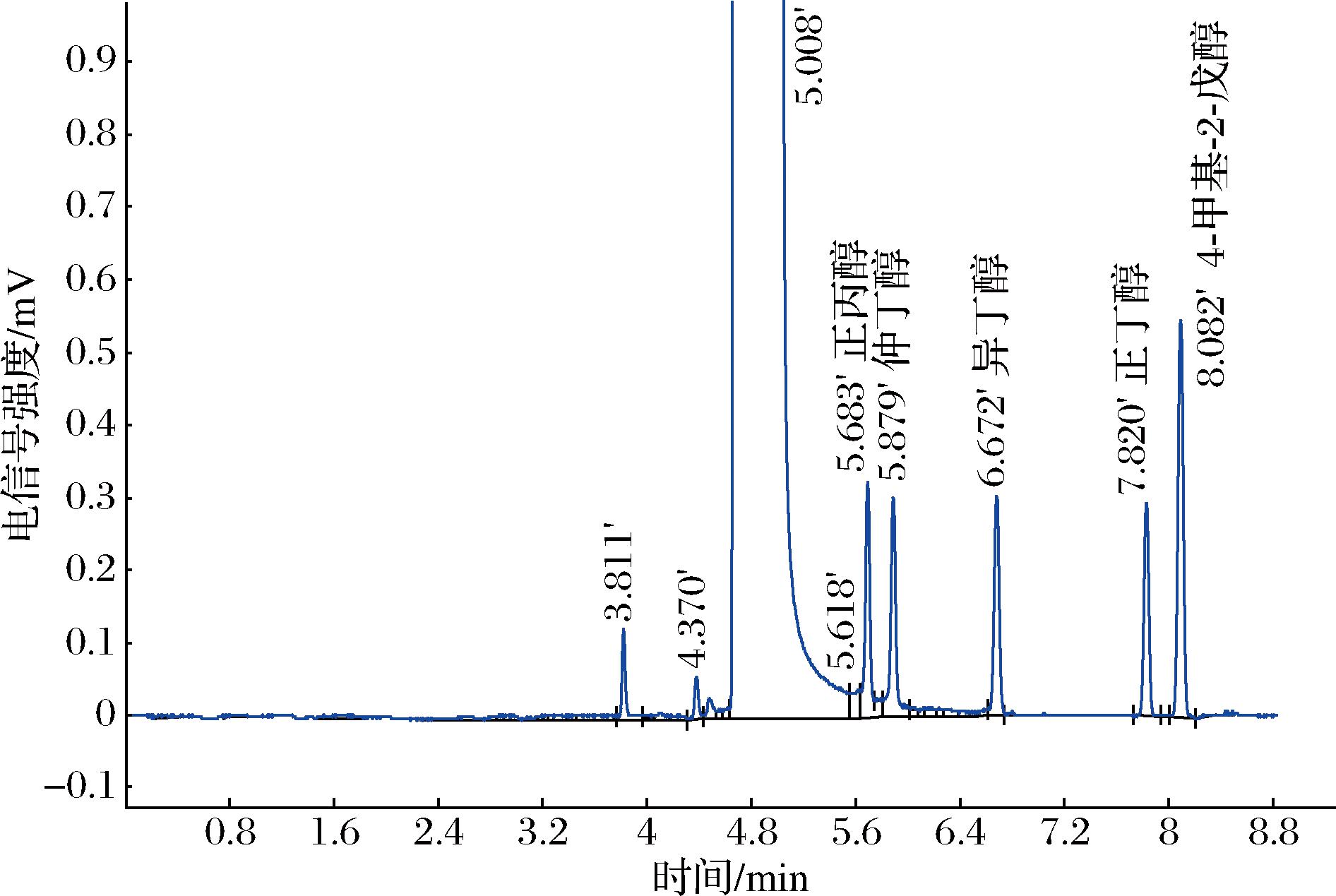 参照甄会英[17]的方法并做修改,得回归方程y=264.21x-303.34,R2=0.996,计算各高级醇含量。气相色谱高级醇标准出峰情况如图2所示。