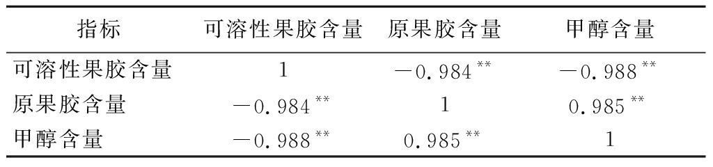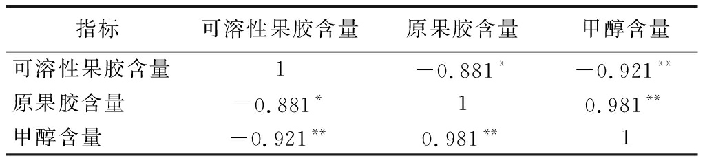 表2 可溶性果胶、原果胶、甲醇含量的相关性