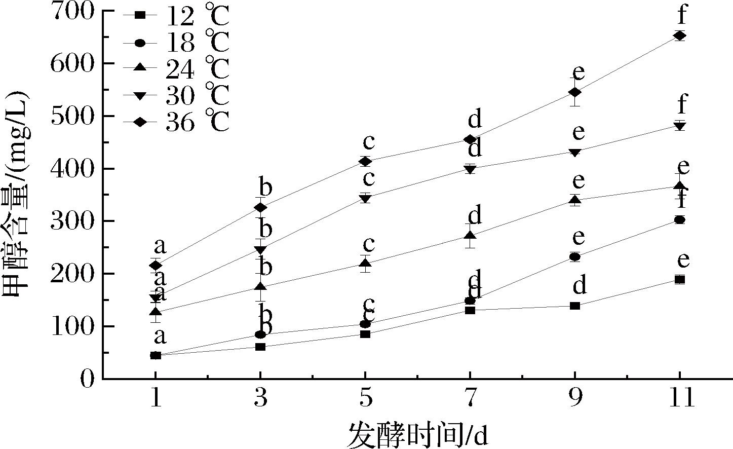 Fig.11 Changes of methanol content during fermentation of jujube wine at different fermentation temperatures