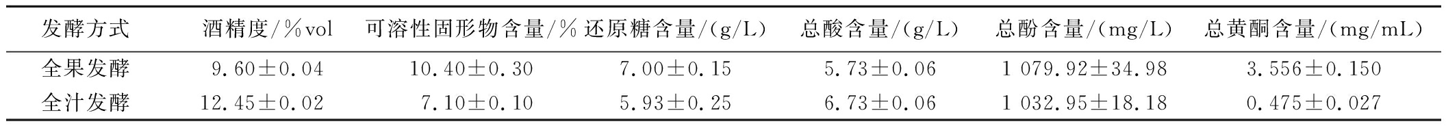 发酵方式酒精度/%vol可溶性固形物含量/%还原糖含量/(g/L)总酸含量/(g/L)总酚含量/(mg/L)总黄酮含量/(mg/mL)全果发酵9.60±0.0410.40±0.307.00±0.155.73±0.061 079.92±34.983.556±0.150全汁发酵12.45±0.027.10±0.105.93±0.256.73±0.061 032.95±18.180.475±0.027